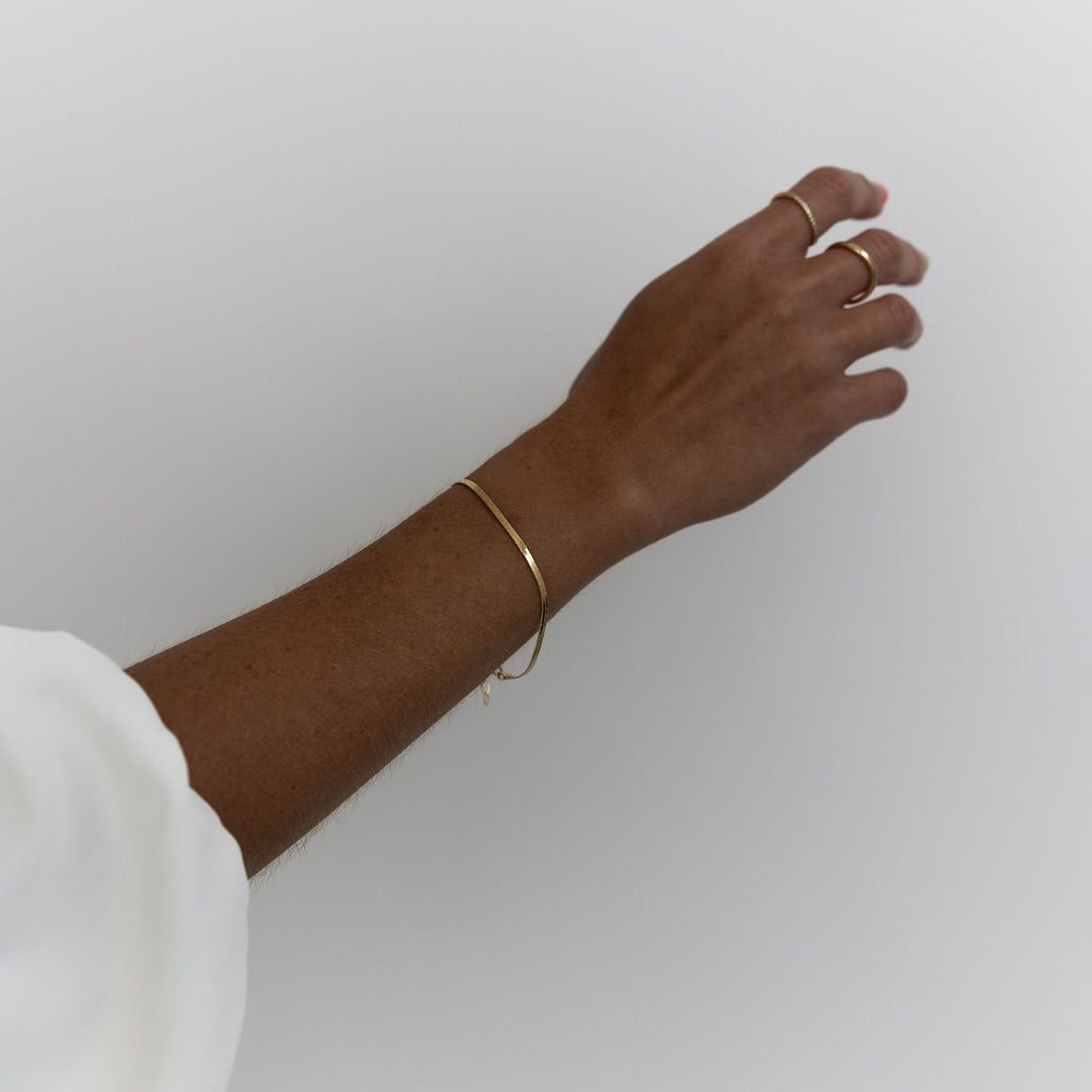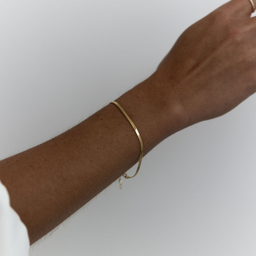 Sleek, smooth, and effortlessly elegant — this gold herringbone bracelet is a true statement of sophistication. With its fluid design and high-shine finish, it lays flat against the wrist, catching the light with every movement. Perfect for dressing up your everyday look or adding a touch of glam to an evening outfit.