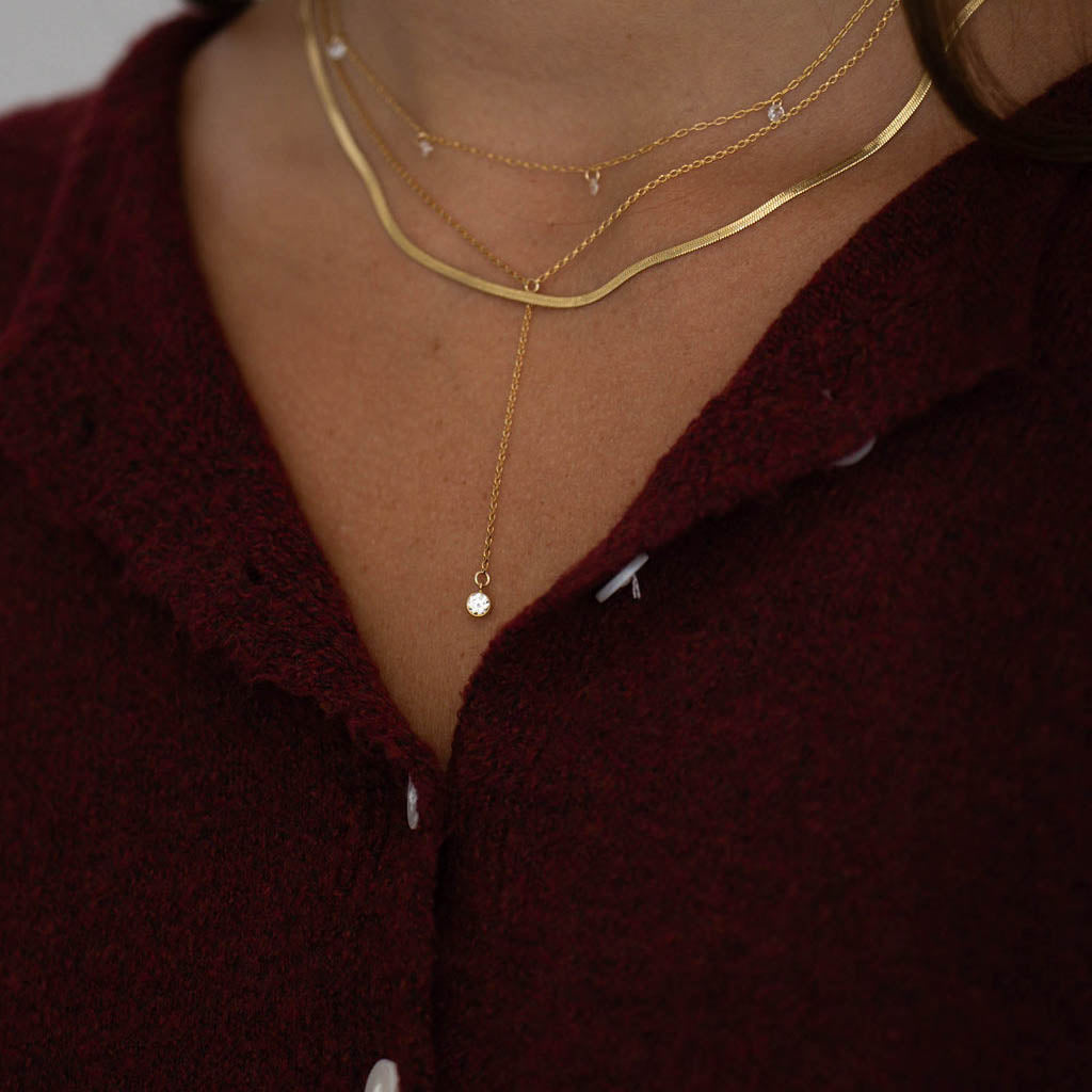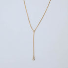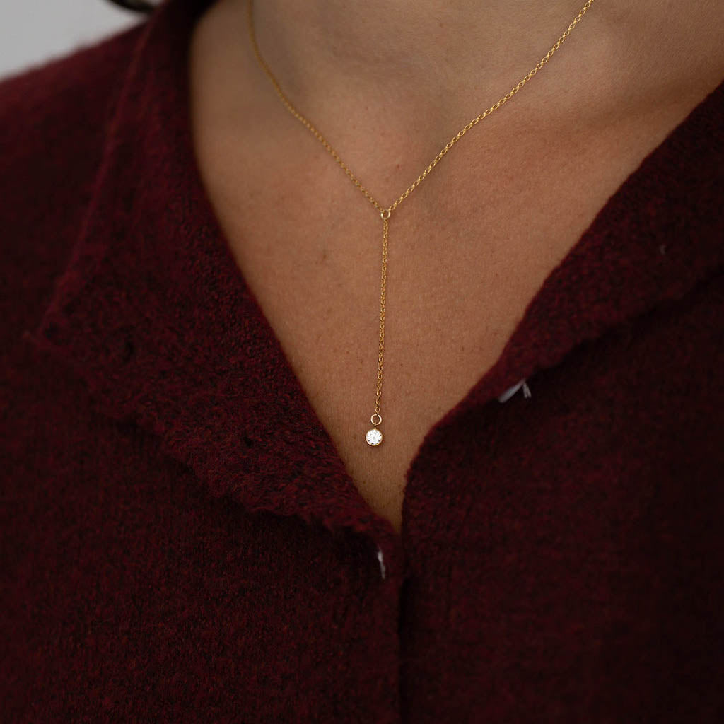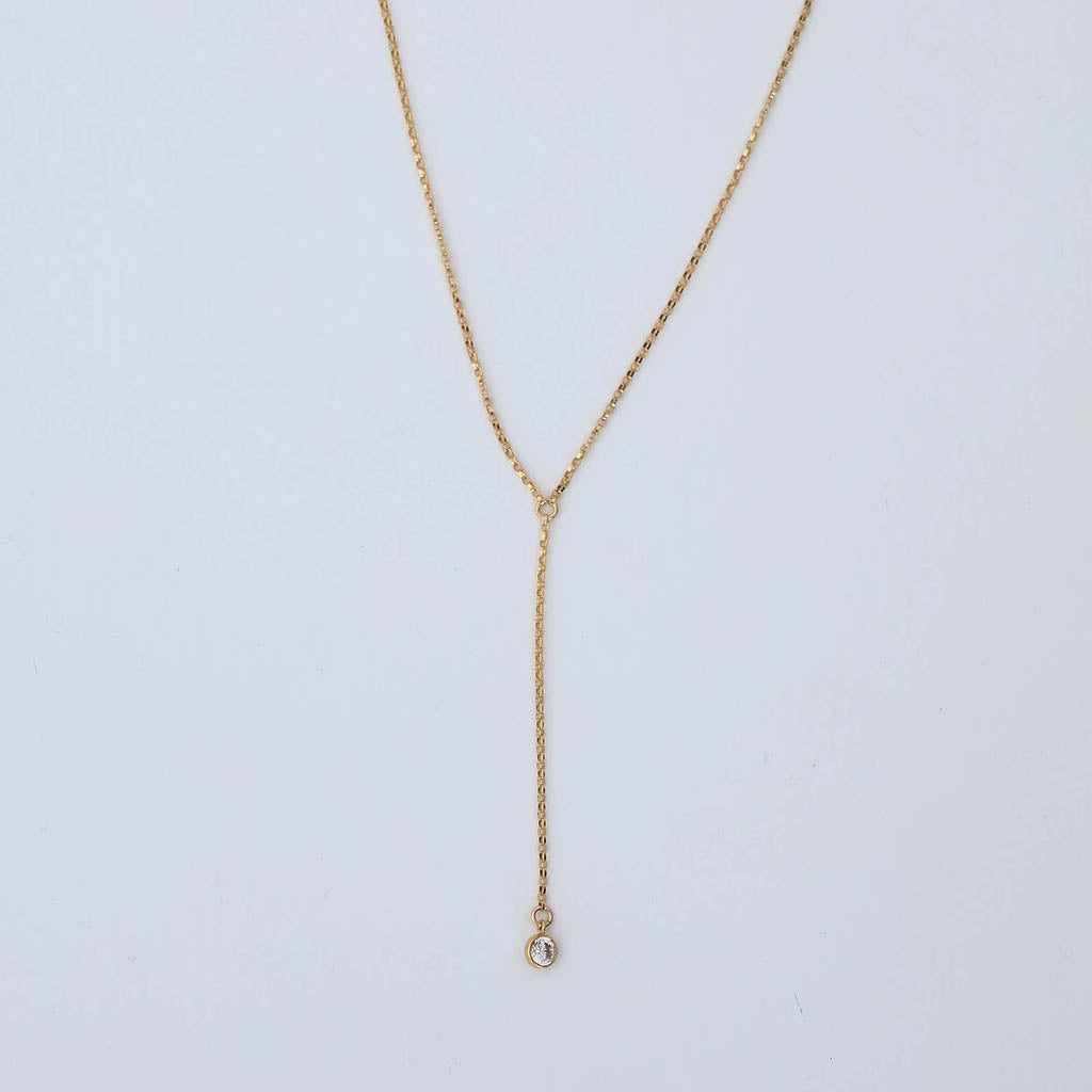 A delicate gold filled lariat featuring a bezel set diamond charm that catches the light with every movement. Chic, minimal, and effortlessly flattering, the perfect piece to dress up a simple neckline or layer with your everyday chains.