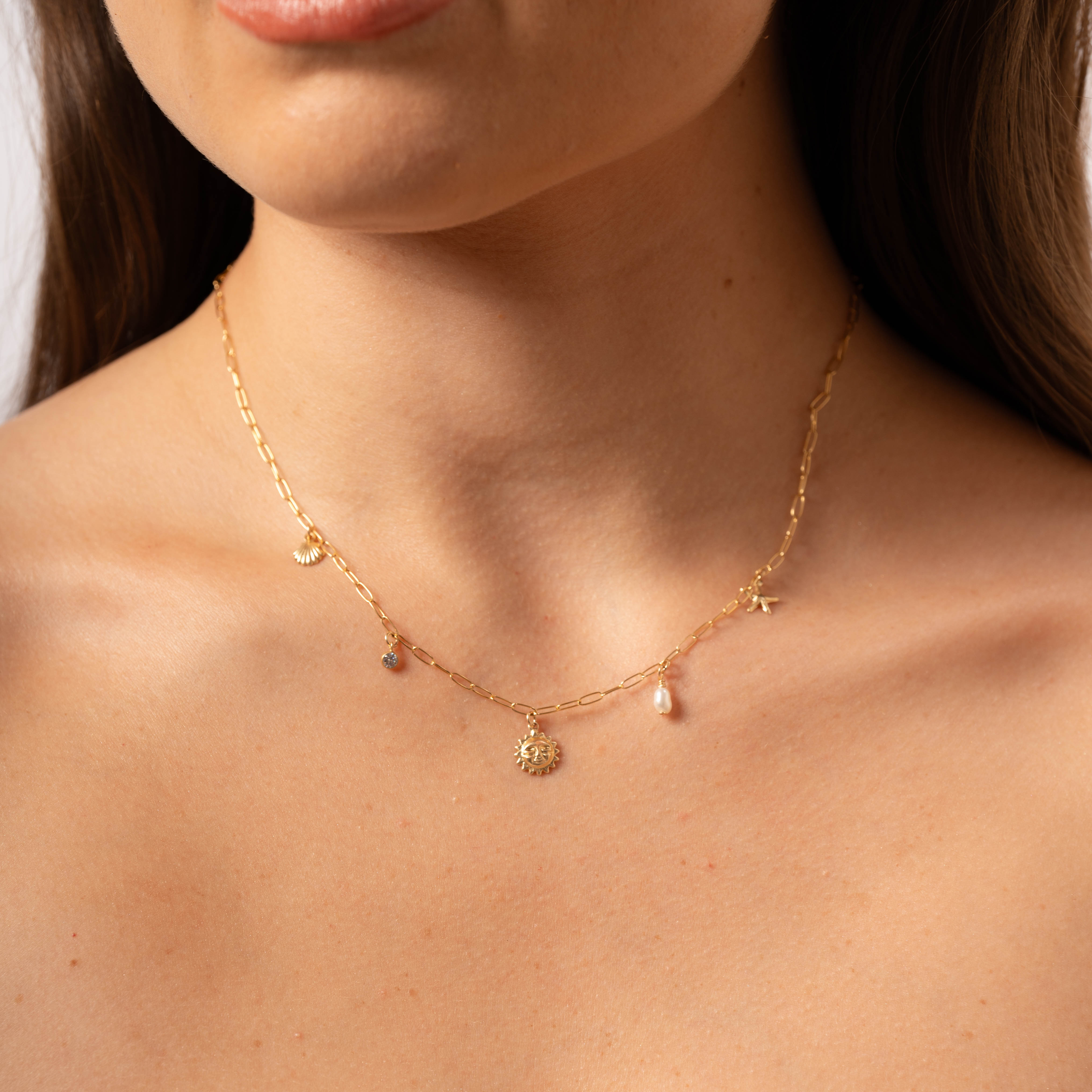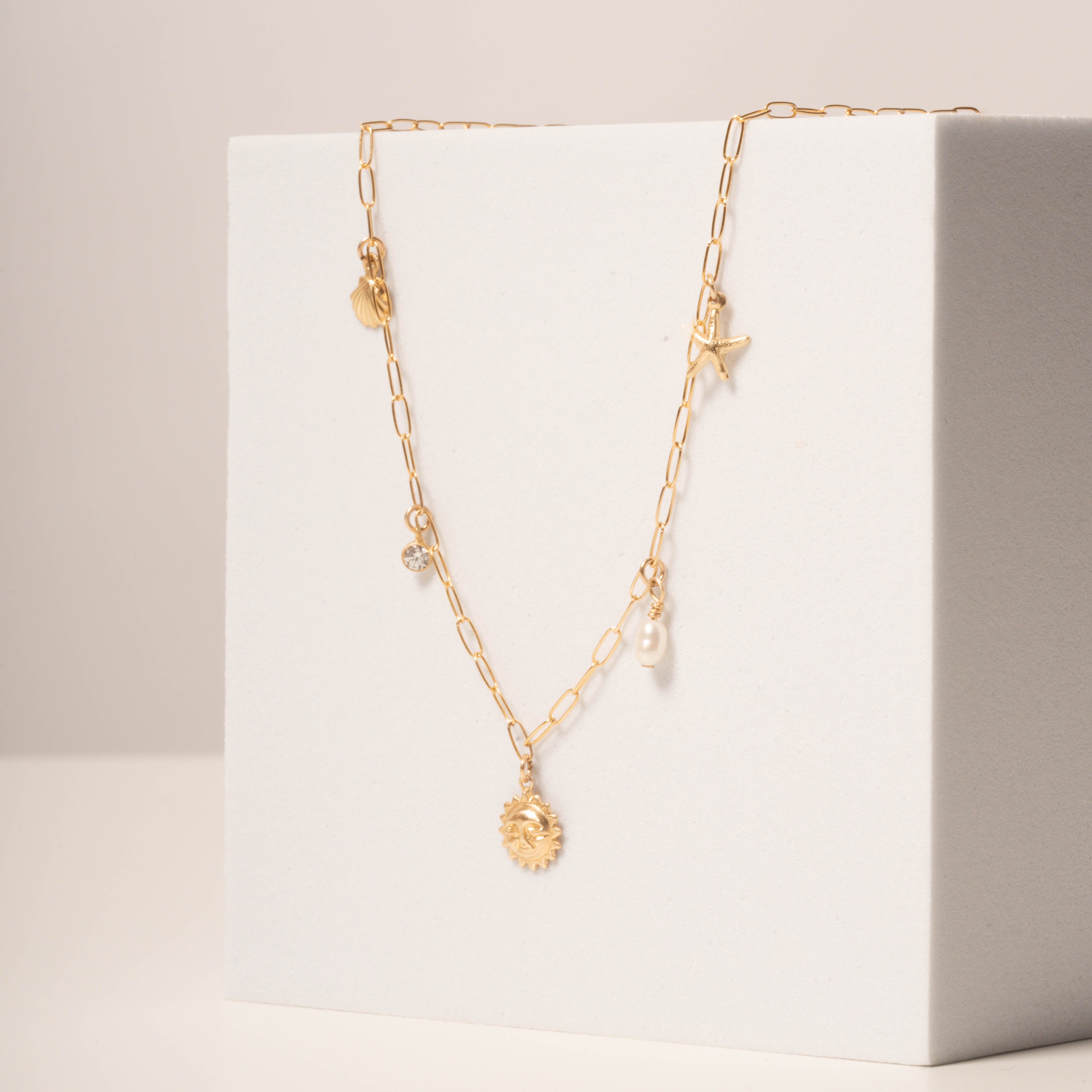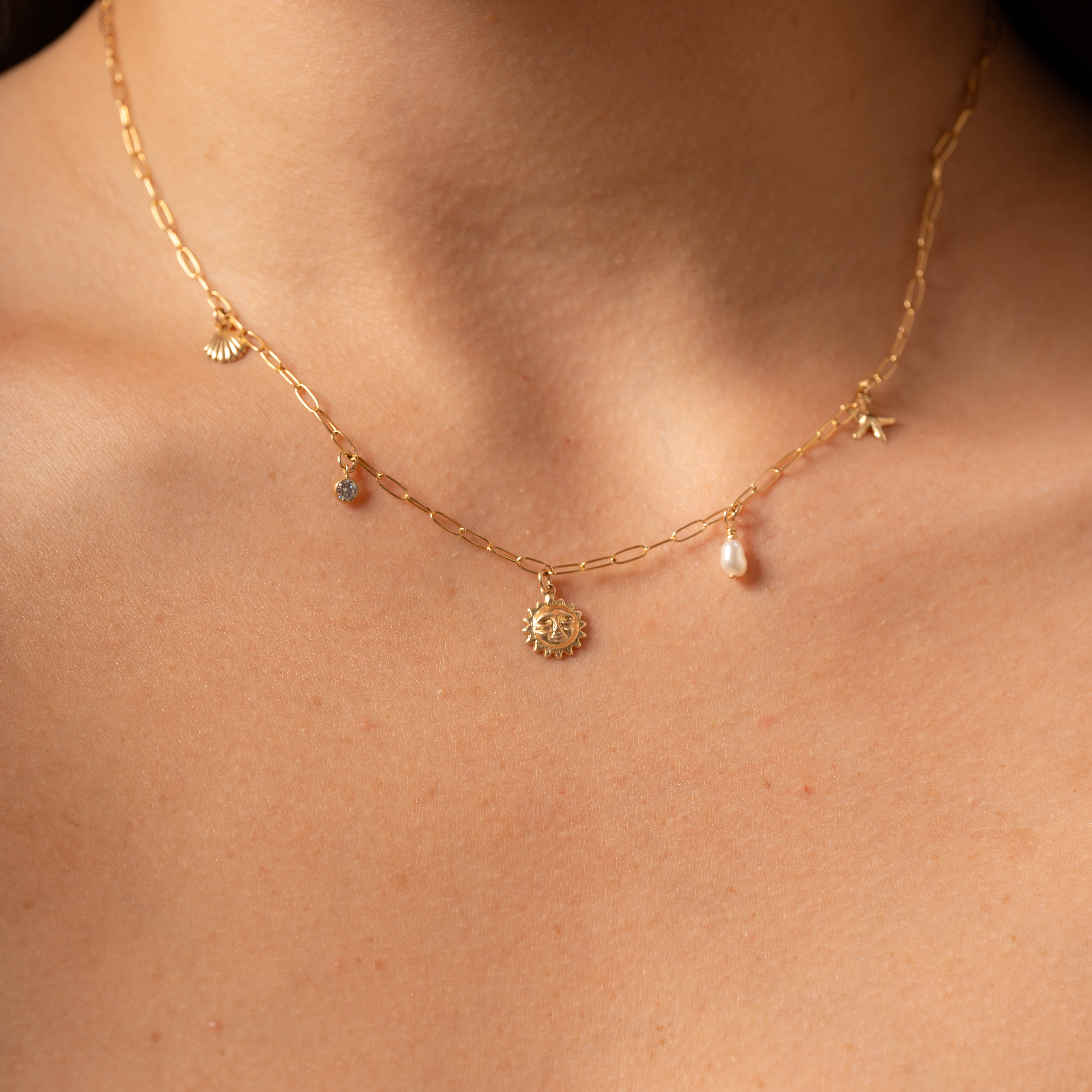 Elevate your summer style with our Summer Charm Necklace, delicately adorned on our Frankie Mini chain. This charming piece features delightful summertime motifs, capturing the essence of the season. Perfect for adding a touch of whimsy to your look, this necklace is a playful and trendy accessory for warm, sunny days.