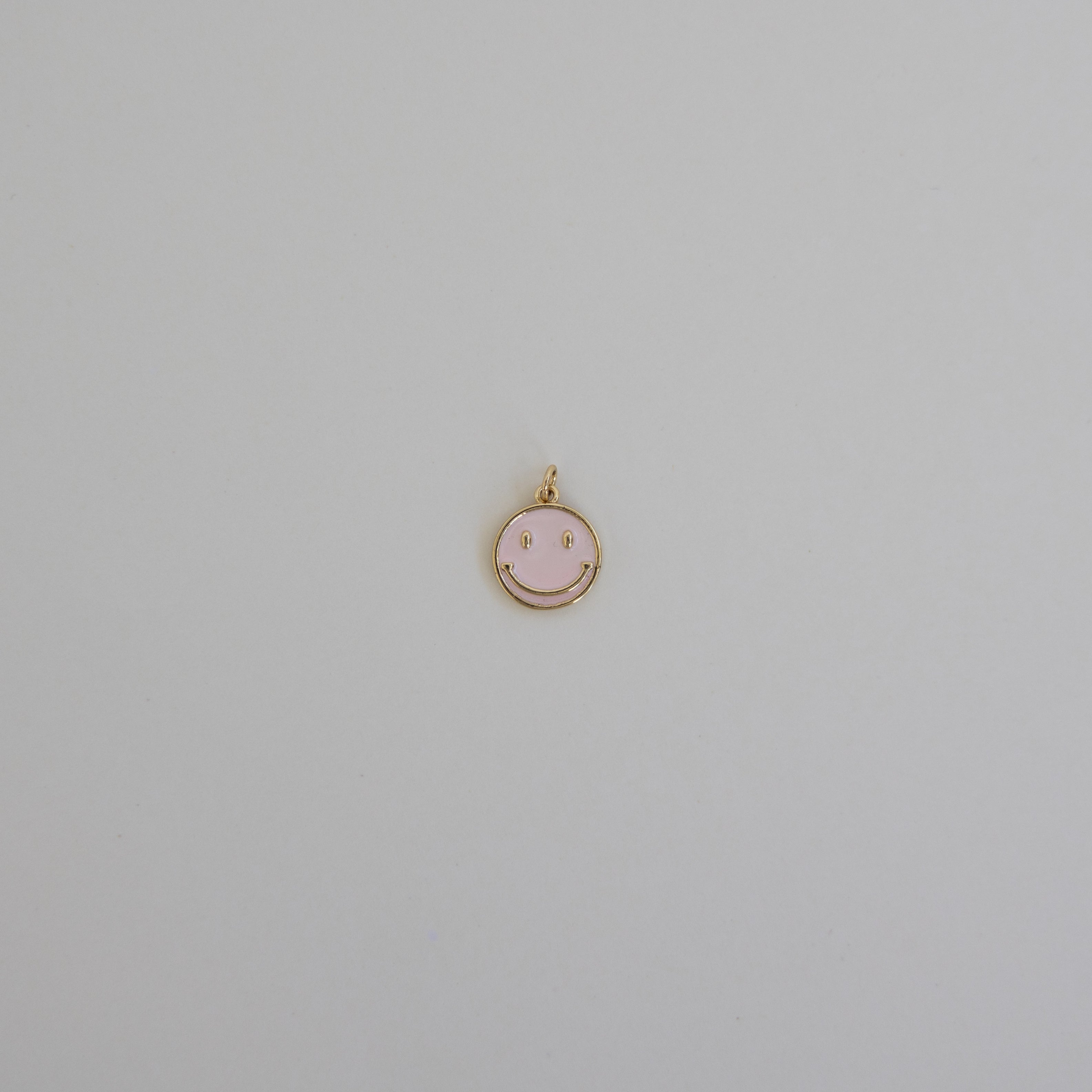 Brighten your day with this charming gold smiley face charm, featuring a soft pink enamel finish for a fun and playful touch to any jewelry collection.