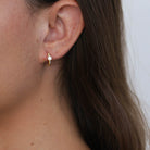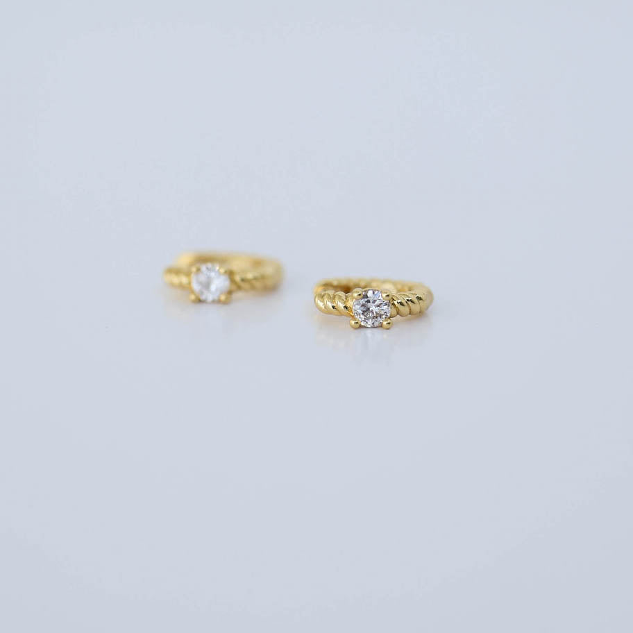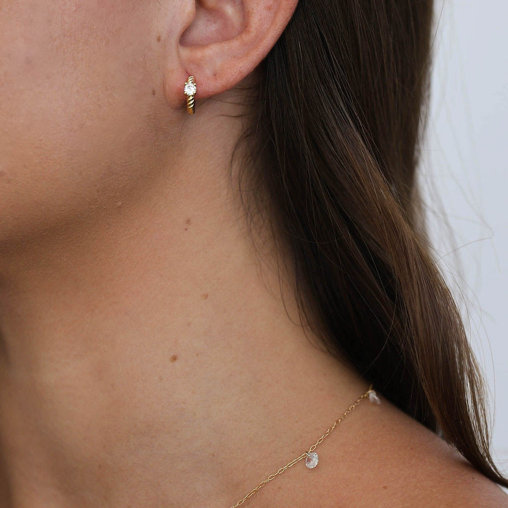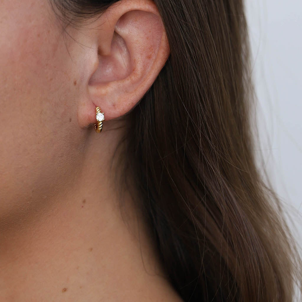 These gold-filled twisted rope huggies feature a single diamond at the center, adding just the right touch of sparkle to their timeless, textured design. Lightweight, durable, and elegant—perfect for daily wear or stacking with your favorite pieces.