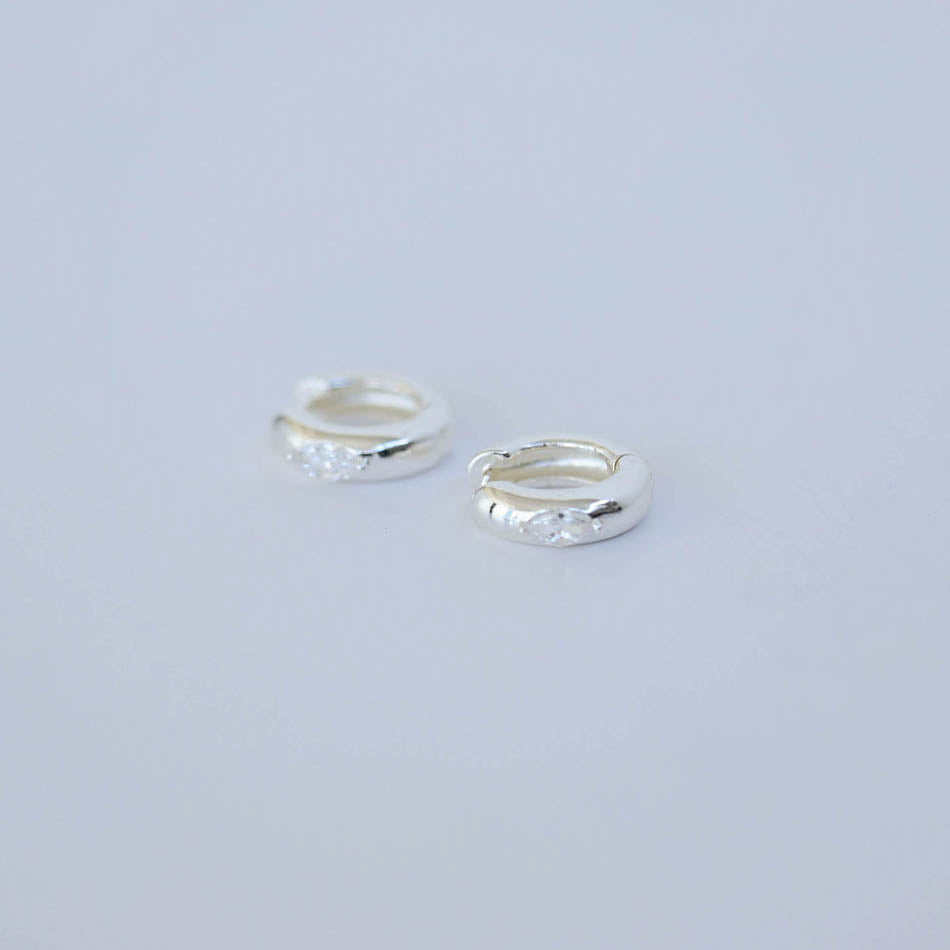 Sterling silver huggies featuring a diamond-shaped diamond charm for a sleek, modern sparkle. Dainty, durable, and perfect for everyday shine.