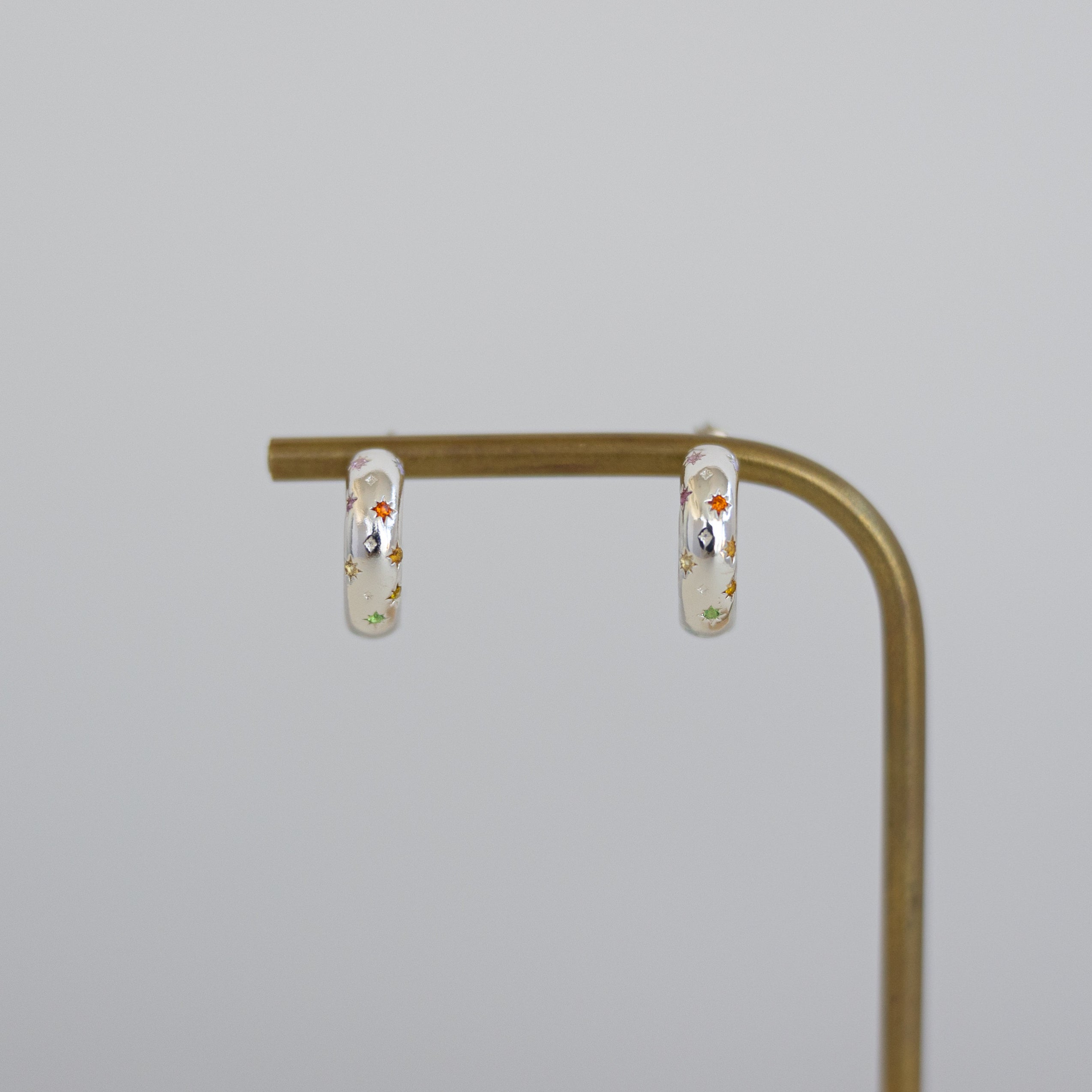 Add a touch of celestial charm to your look with these sterling silver hoops beautifully adorned with delicate engraved stars and multicolored gemstones. Their dainty yet eye-catching design makes them perfect for stacking or wearing solo for a subtle cosmic sparkle.