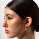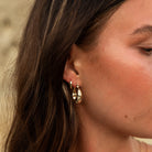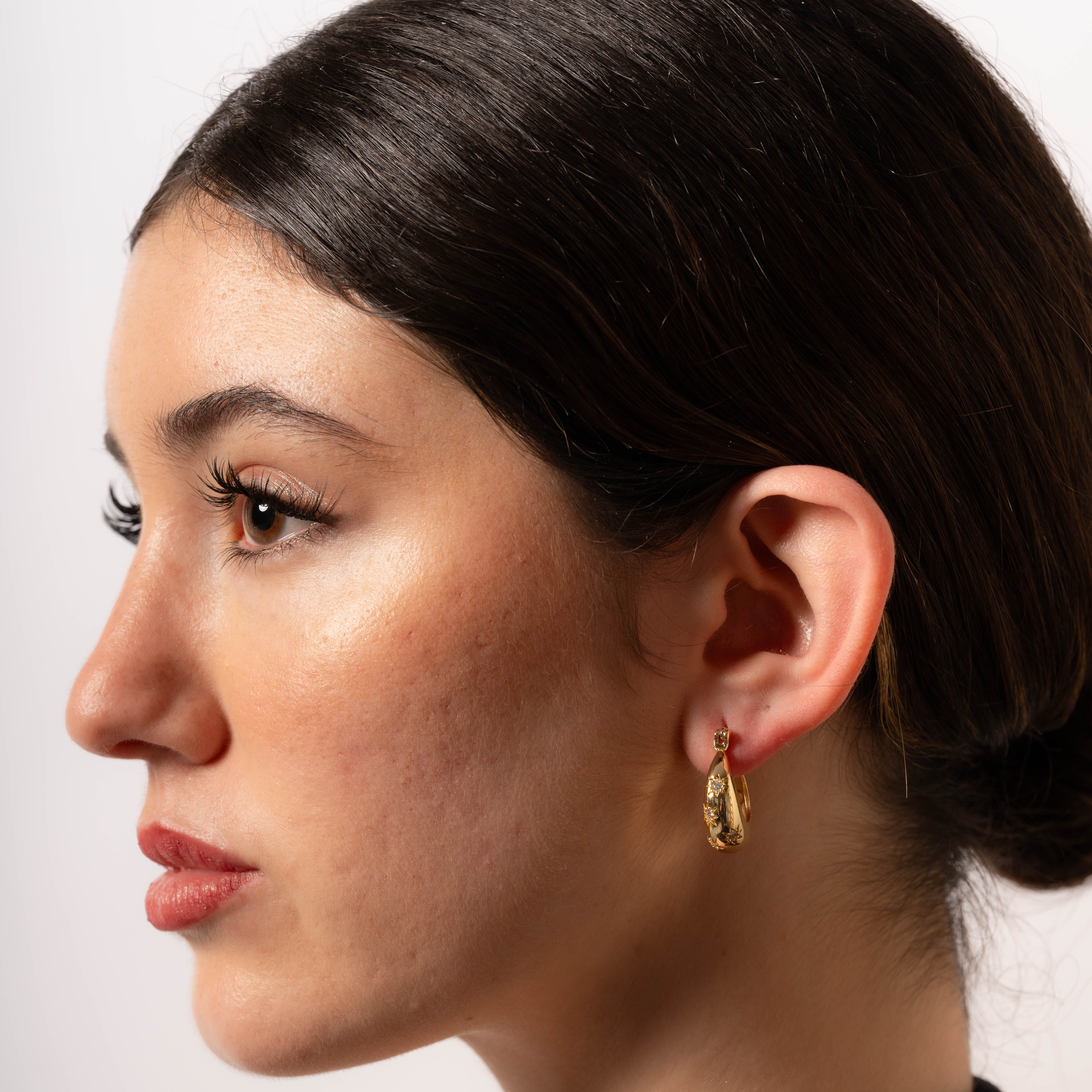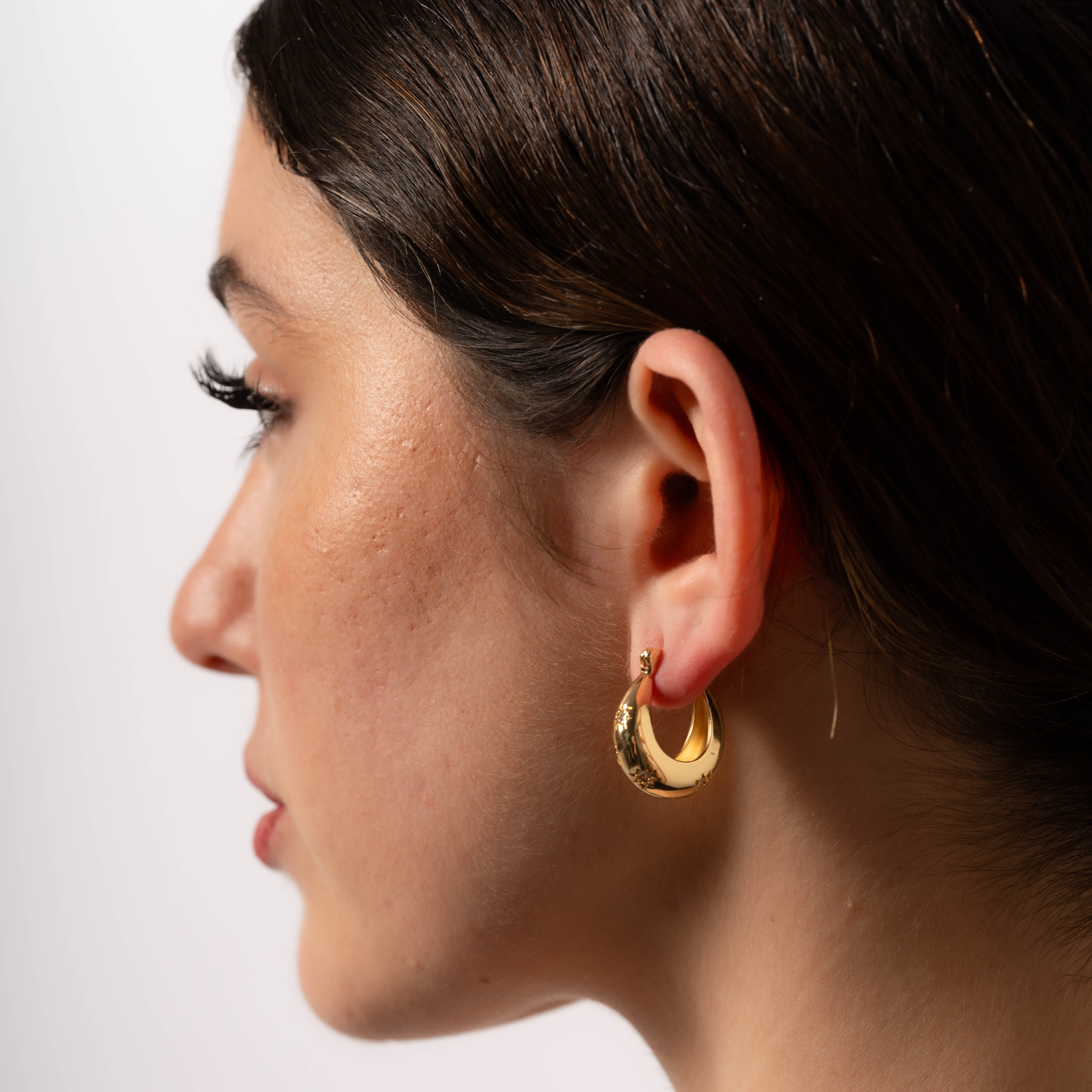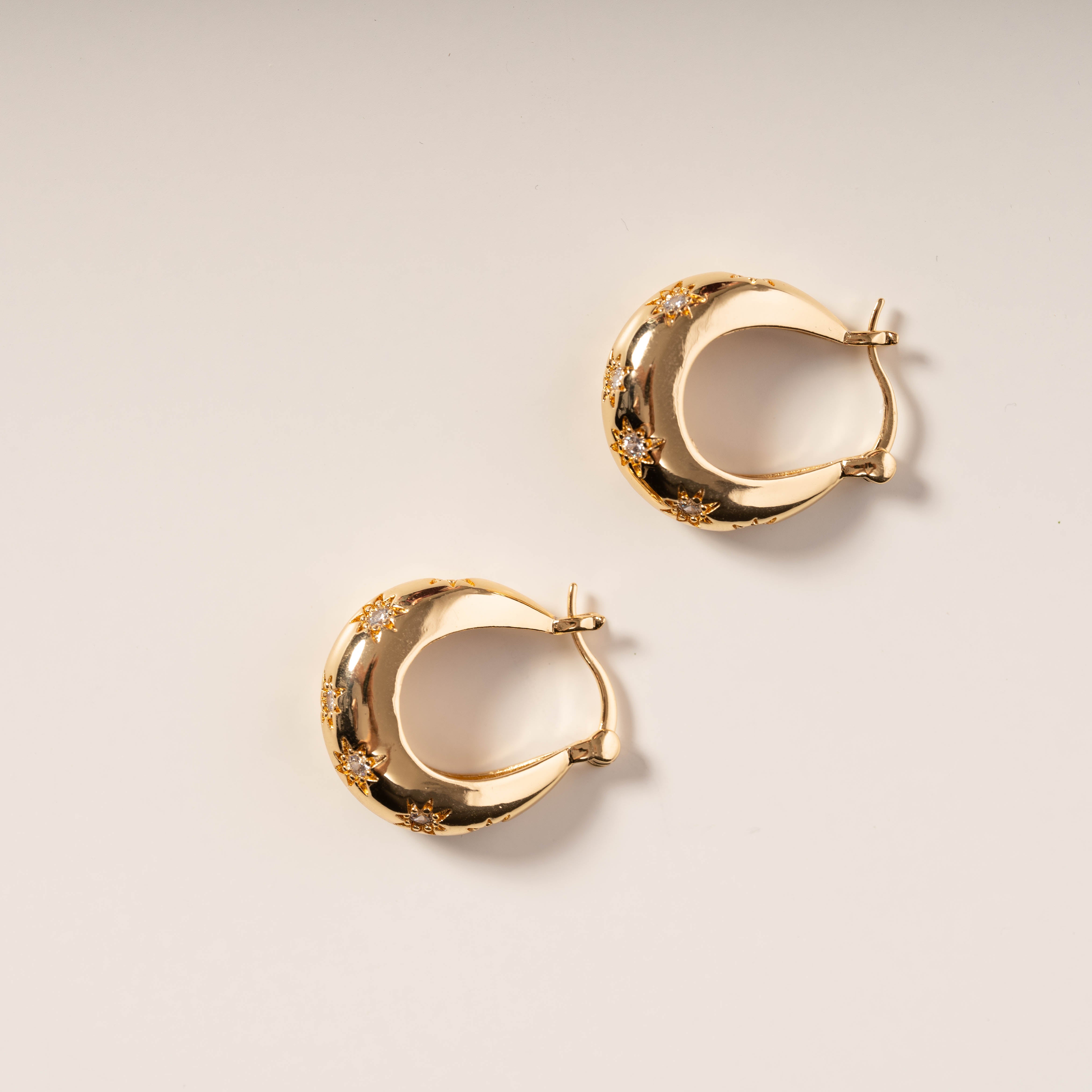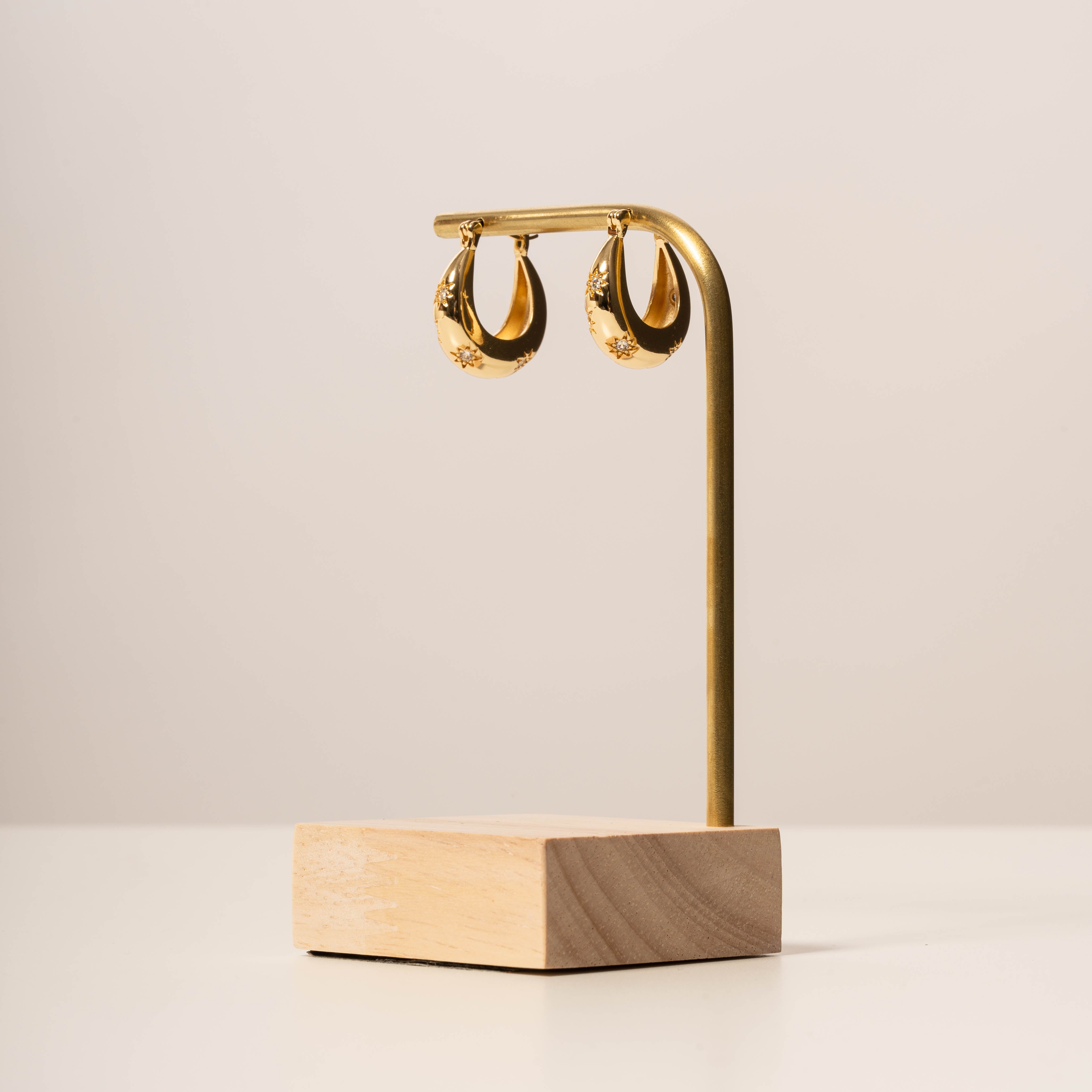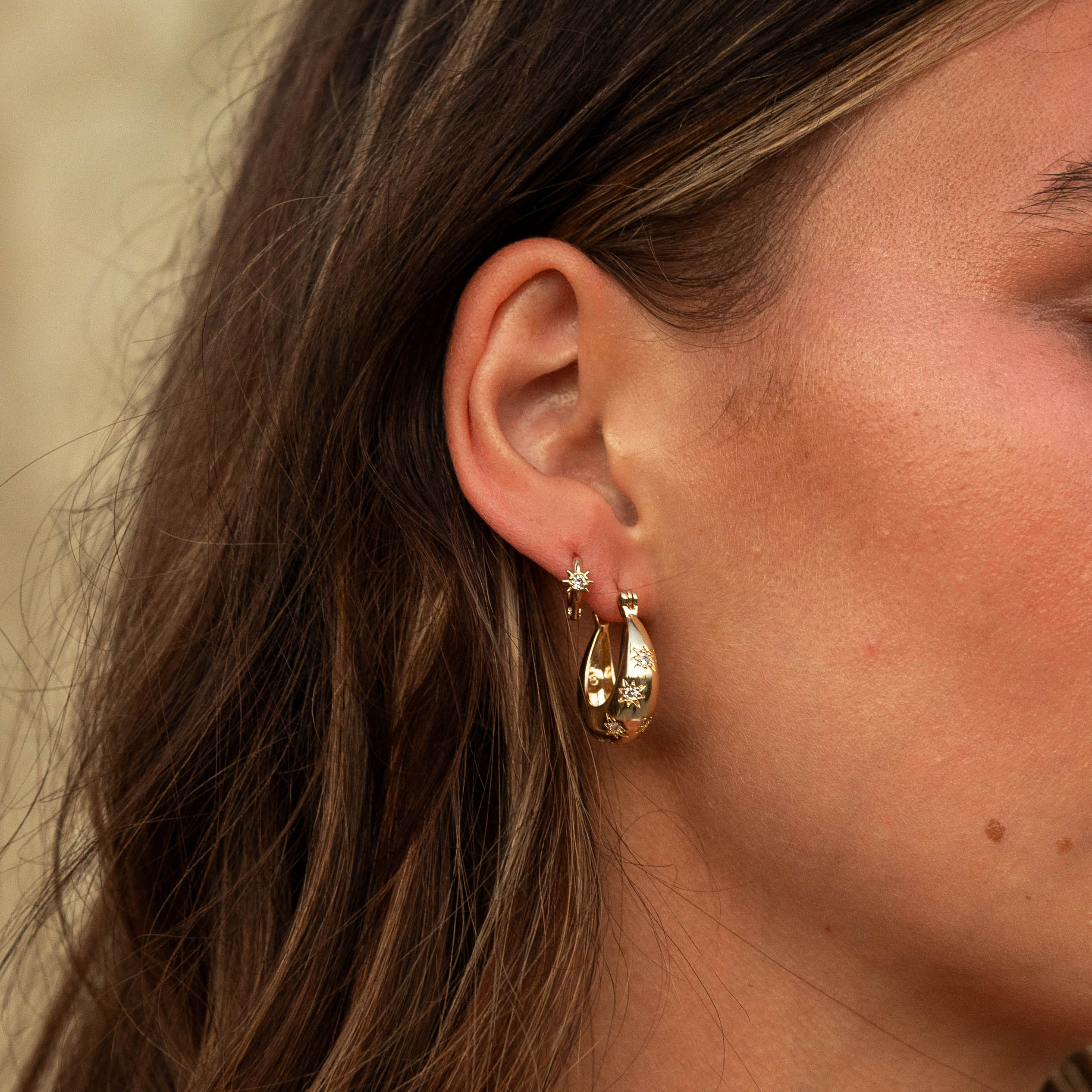 These celestial-inspired hoops feature an elegant oblong shape adorned with captivating stars, adding a touch of cosmic charm to your look. Elevate your style and let your personality sparkle with these Skylar statement hoops.