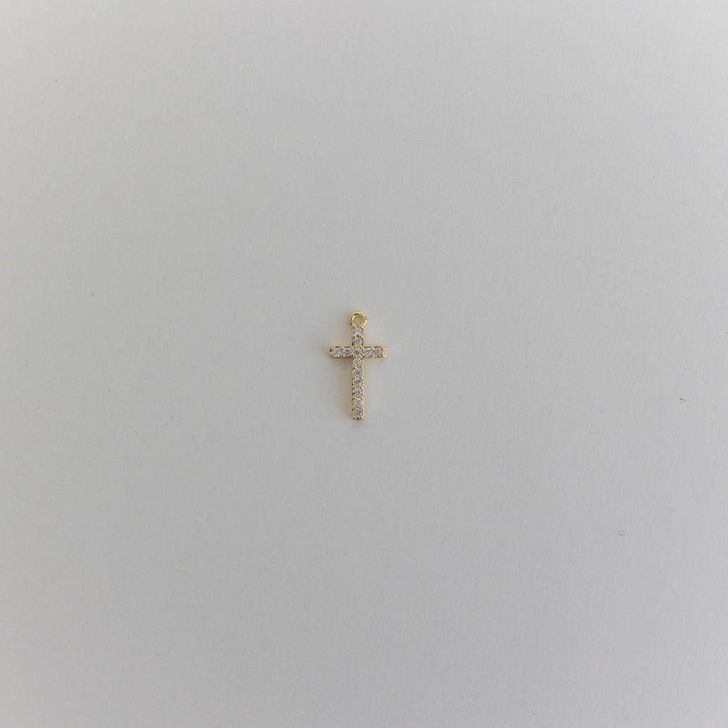 A delicate gold cross charm accented with shimmering cubic zirconia.
