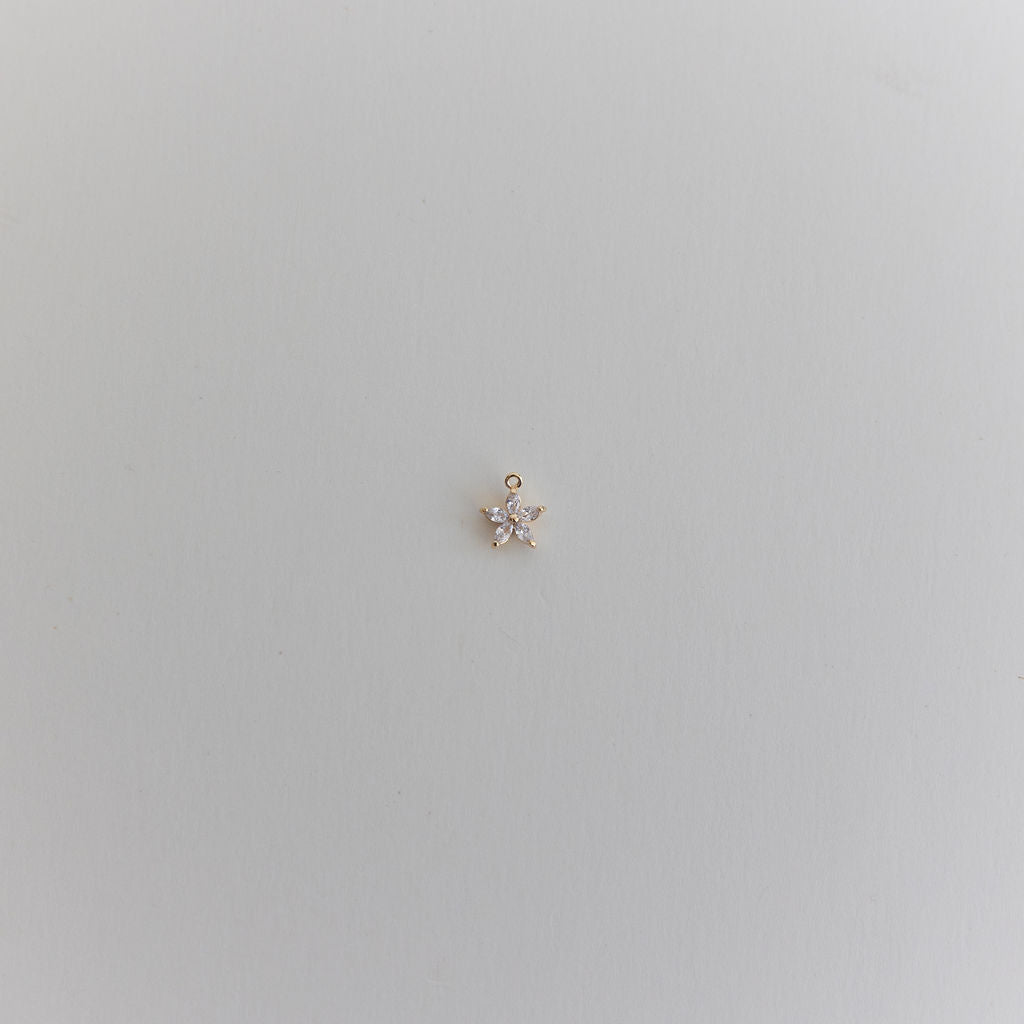 A delicate flower charm with shimmering cubic zirconia stones, designed to capture the light beautifully. Perfect for adding a subtle sparkle to any piece.