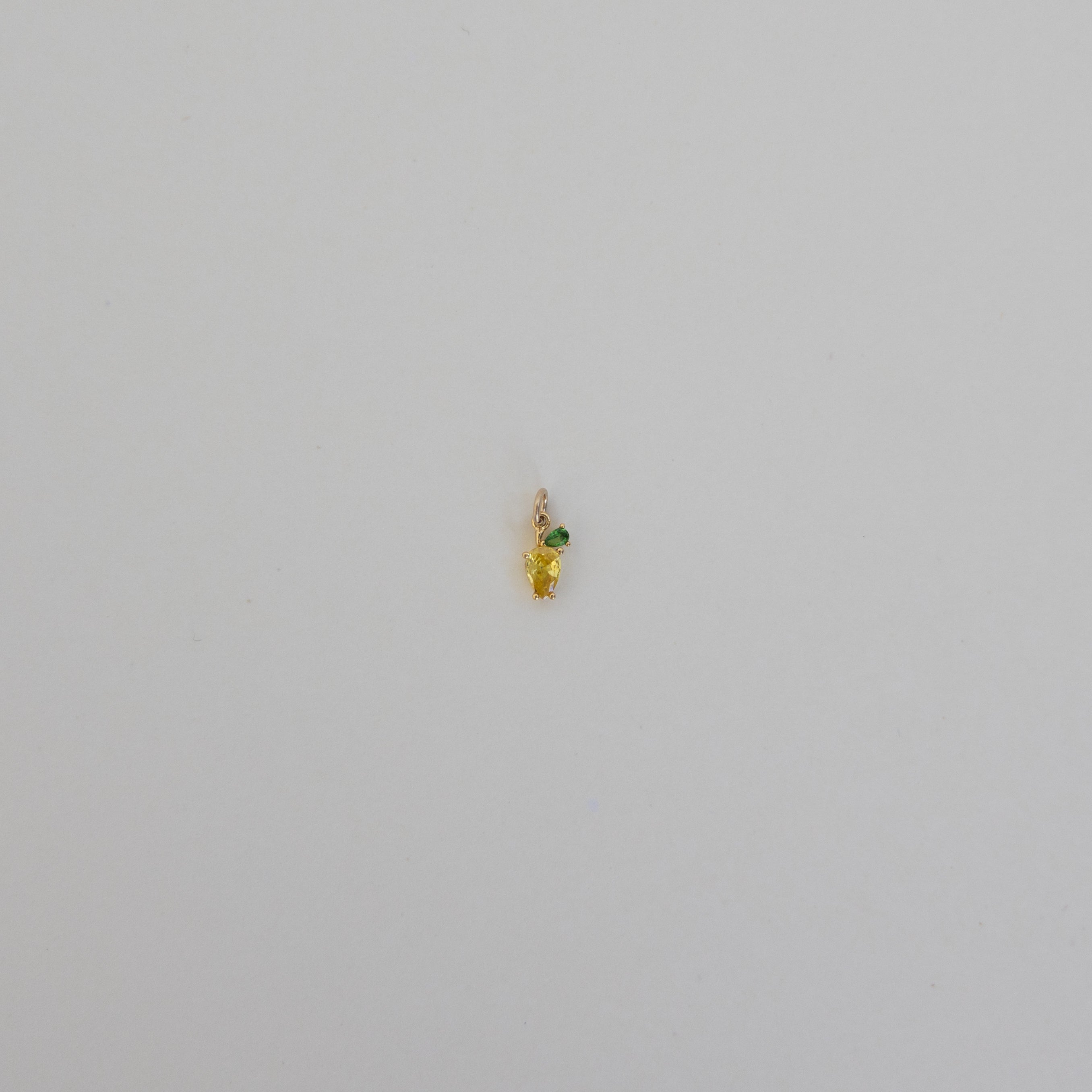 A charming lemon pendant featuring a vibrant yellow and green cubic zirconia.