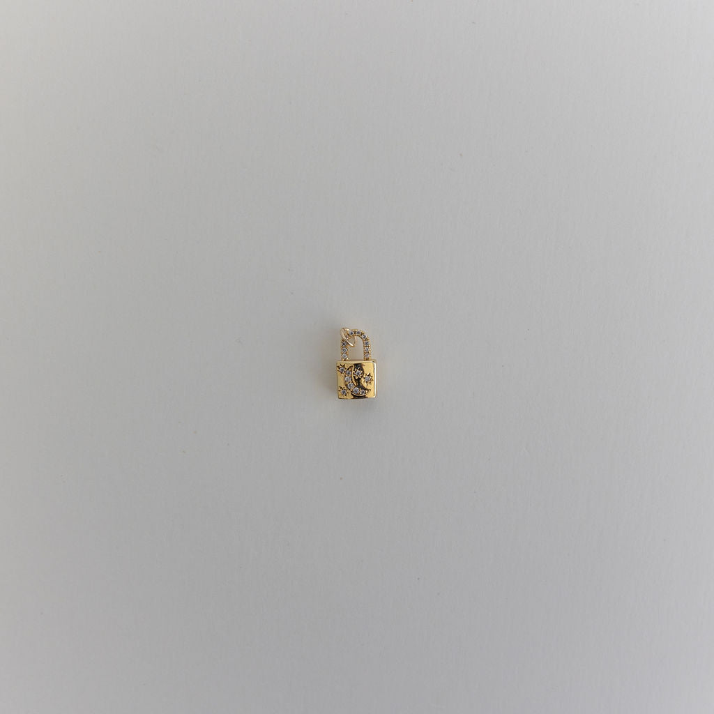 Mini gold lock charm with crystal details and engraved flourish. Symbolic and stylish with a touch of edge.