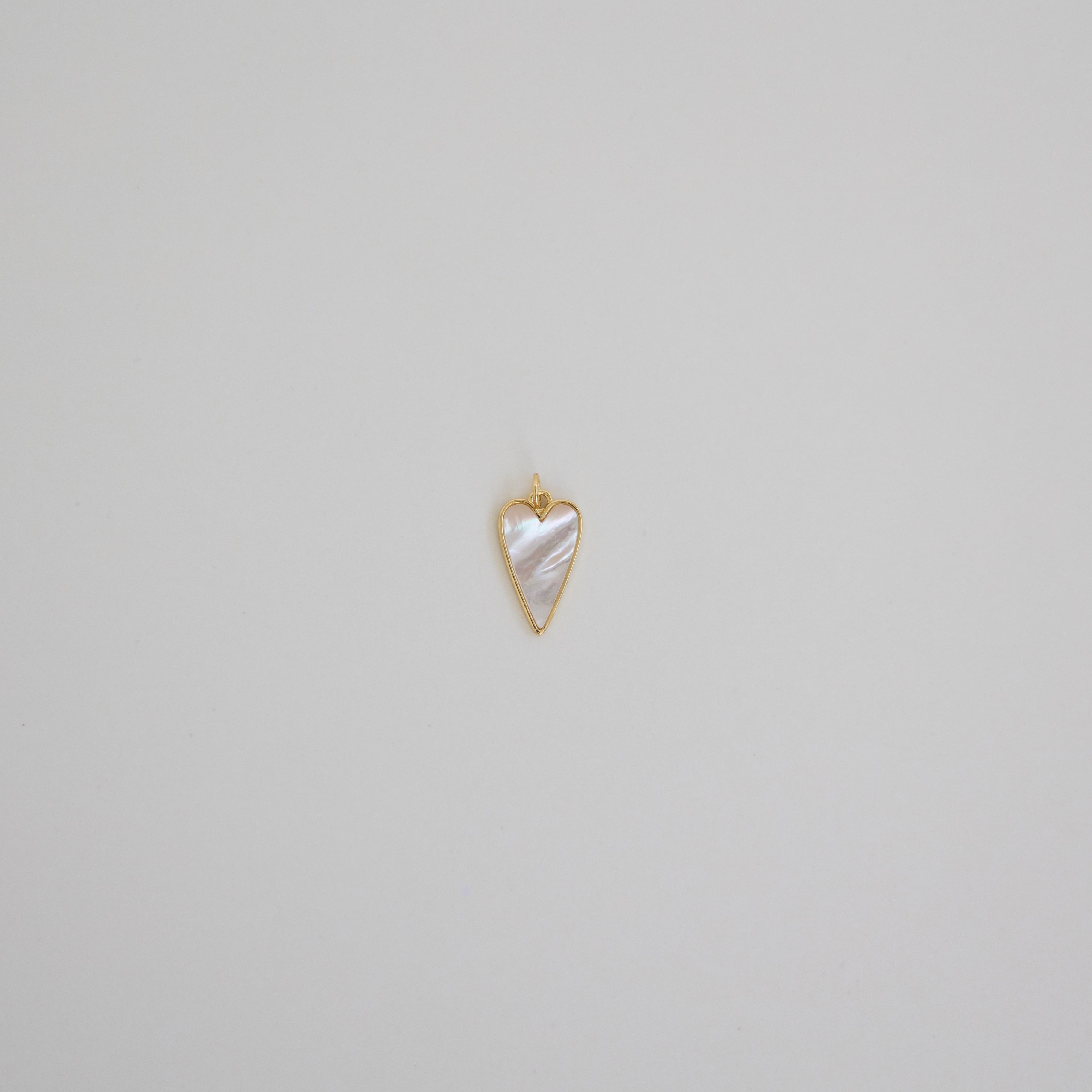 This elegant gold heart charm features a luminous mother-of-pearl inlay, adding a touch of timeless beauty to any piece.