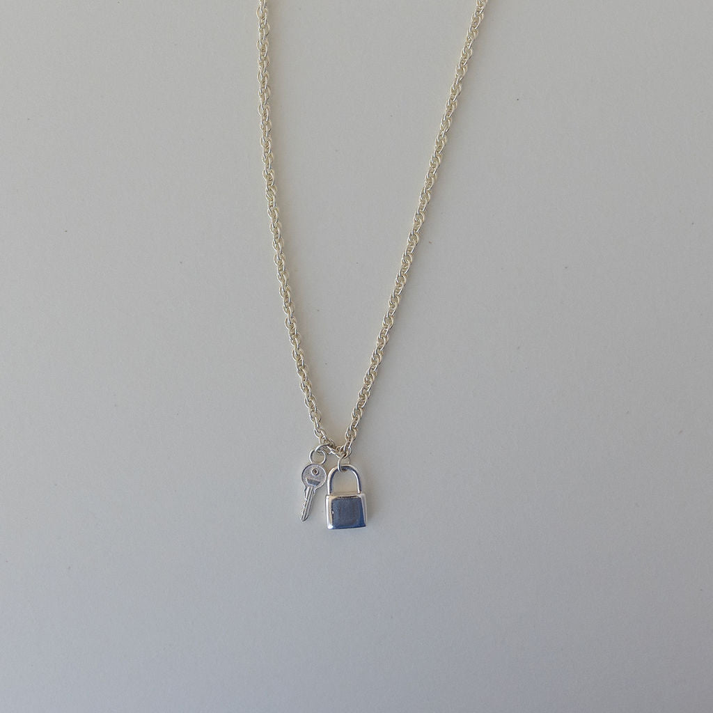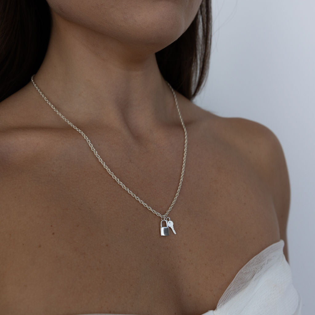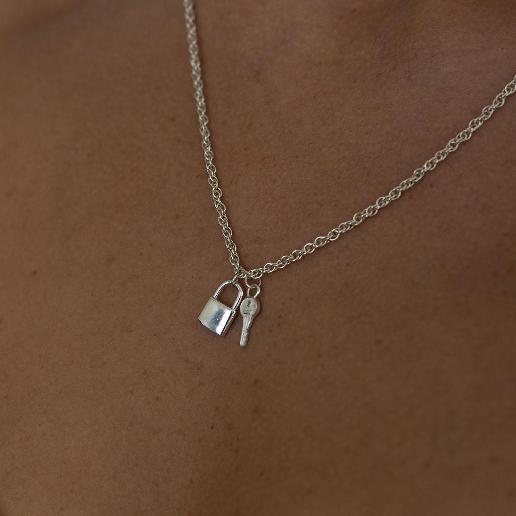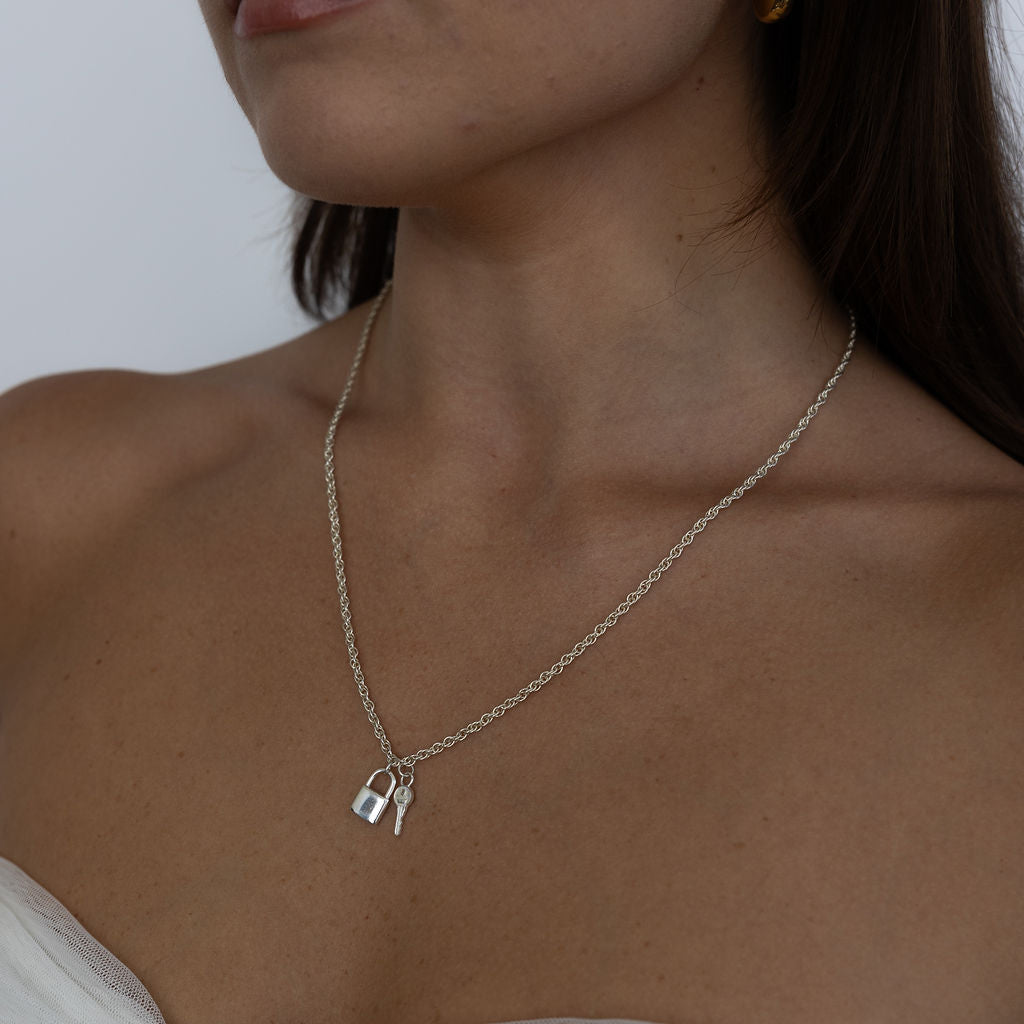 This silver necklace features a delicate chain with charming lock and key pendants. Symbolic and stylish, it’s a playful piece perfect for layering or wearing on its own.