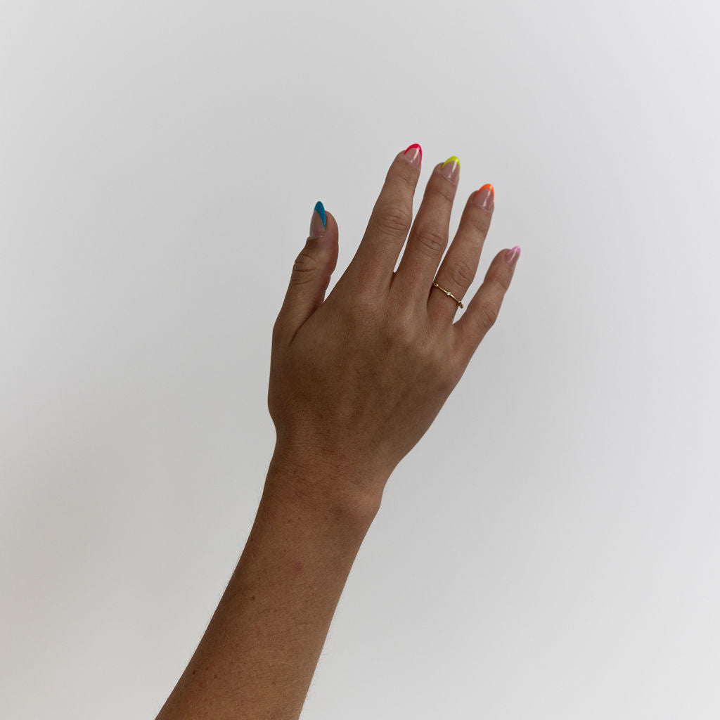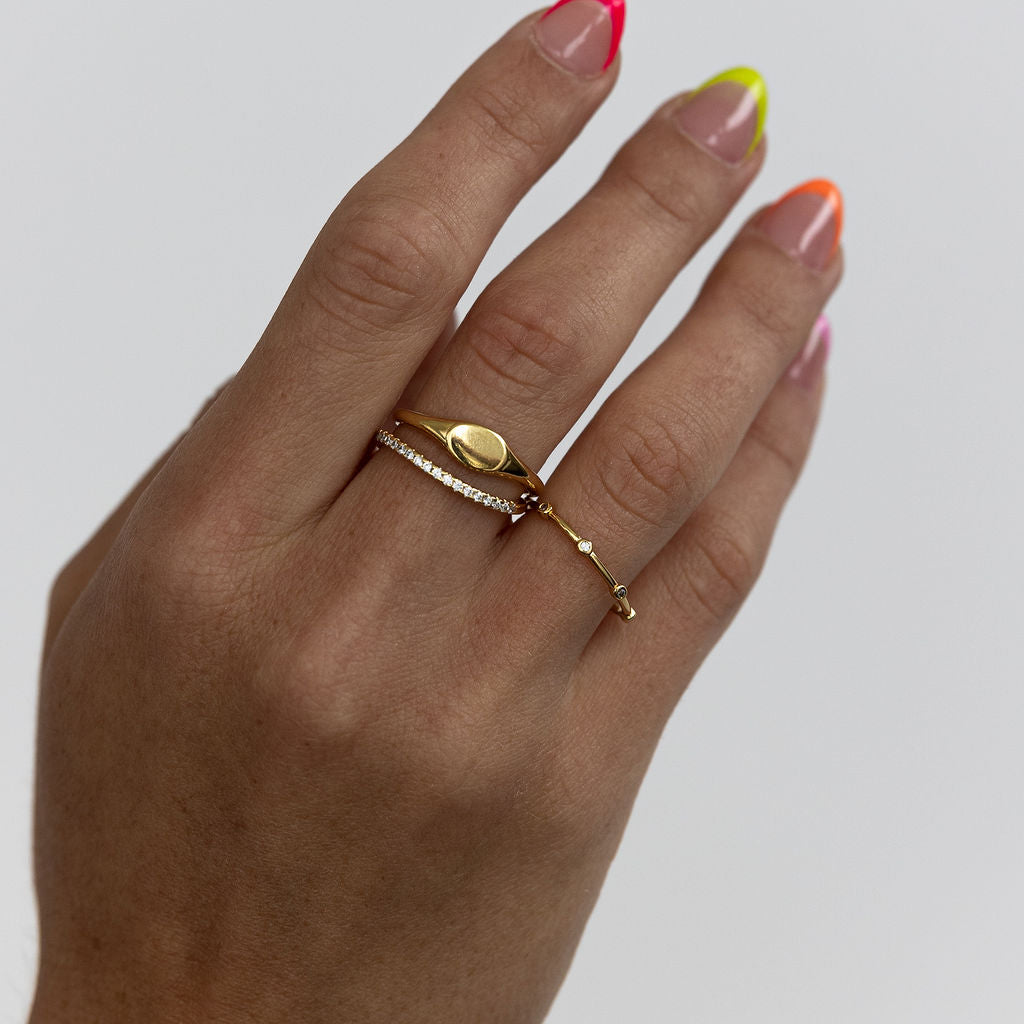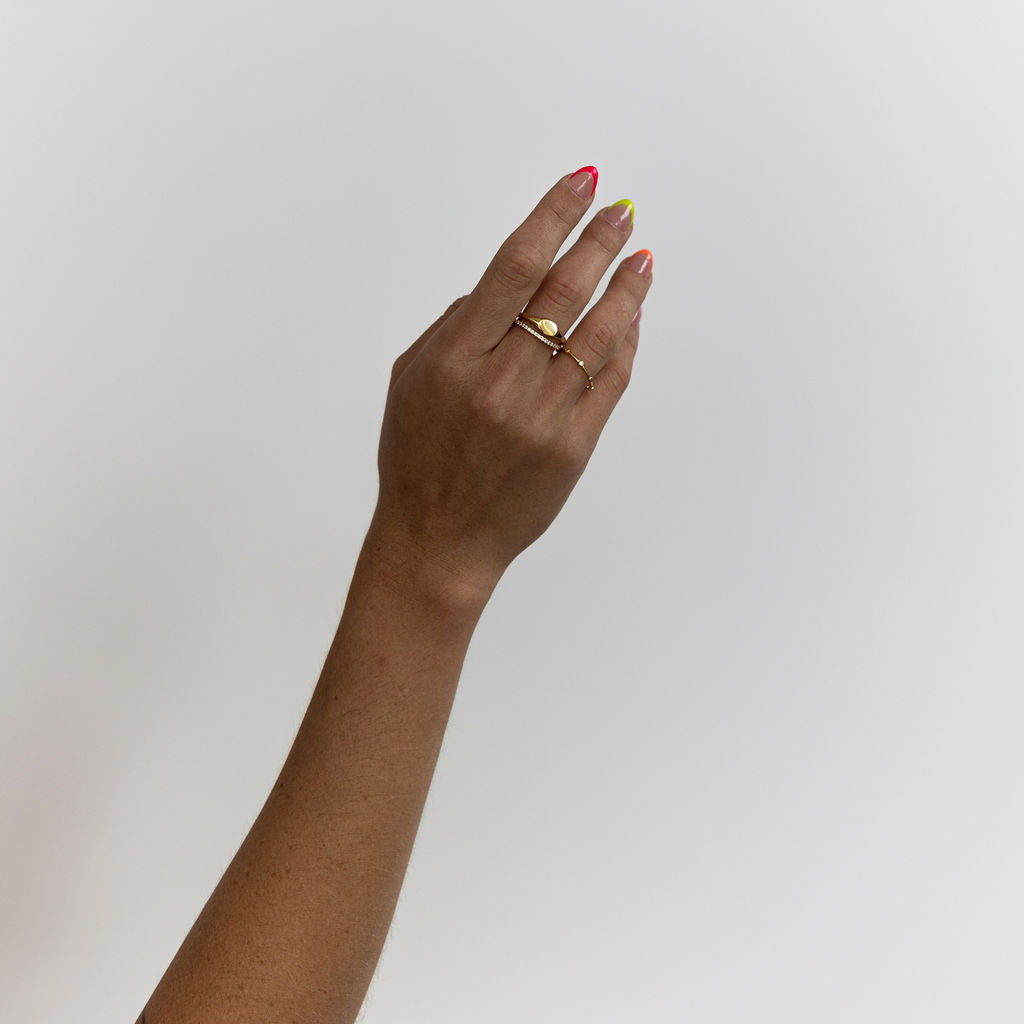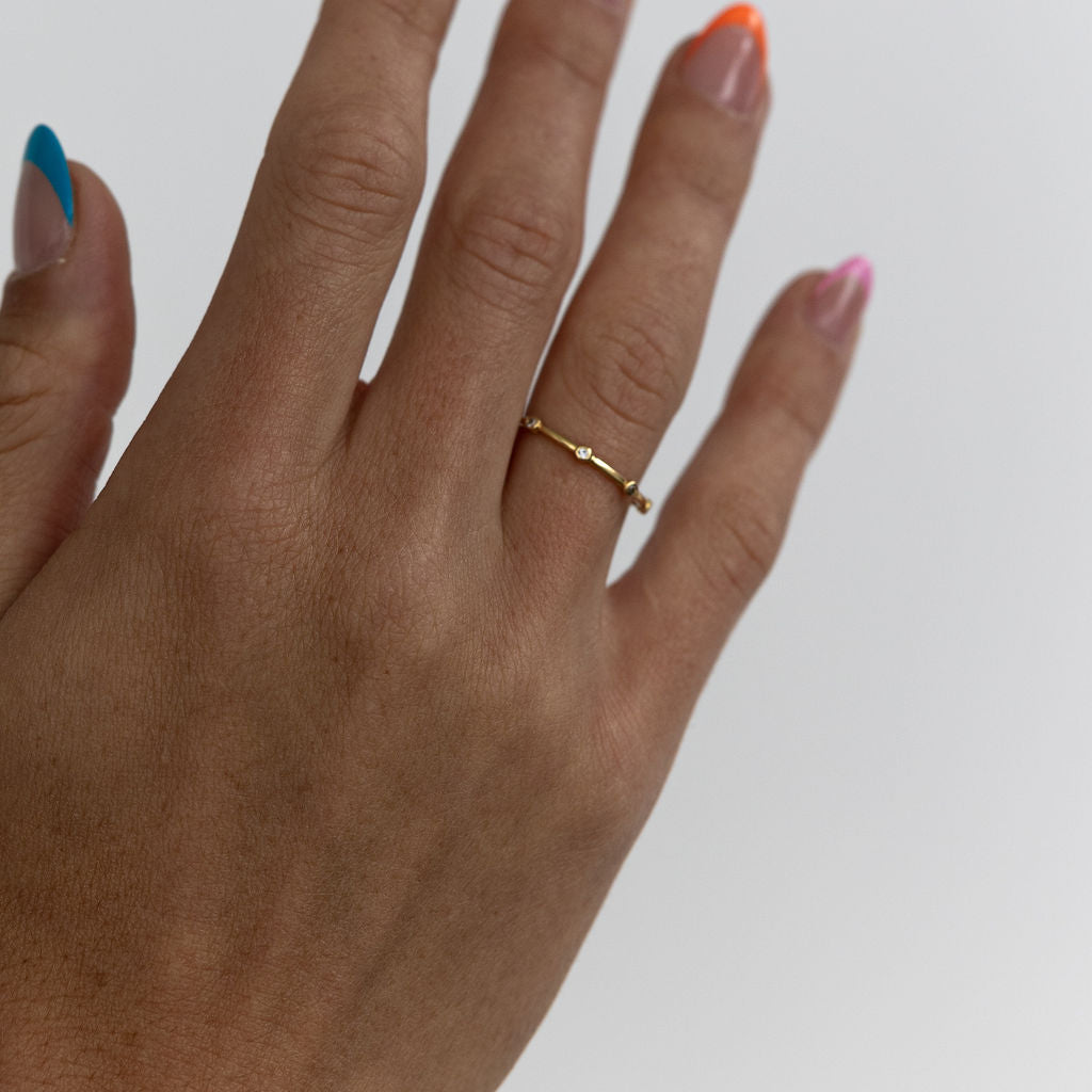 Delicate gold band with dainty bezel-set crystals along a textured, organic-style design. Elegant with a hint of whimsy—perfect for stacking or solo wear.