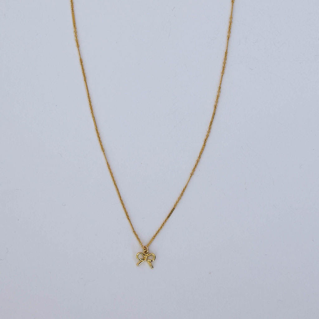 A sweet and minimal gold filled bow pendant on a delicate chain. Soft, feminine, and perfect for everyday wear, a charming piece that layers beautifully with your favorite dainty necklaces