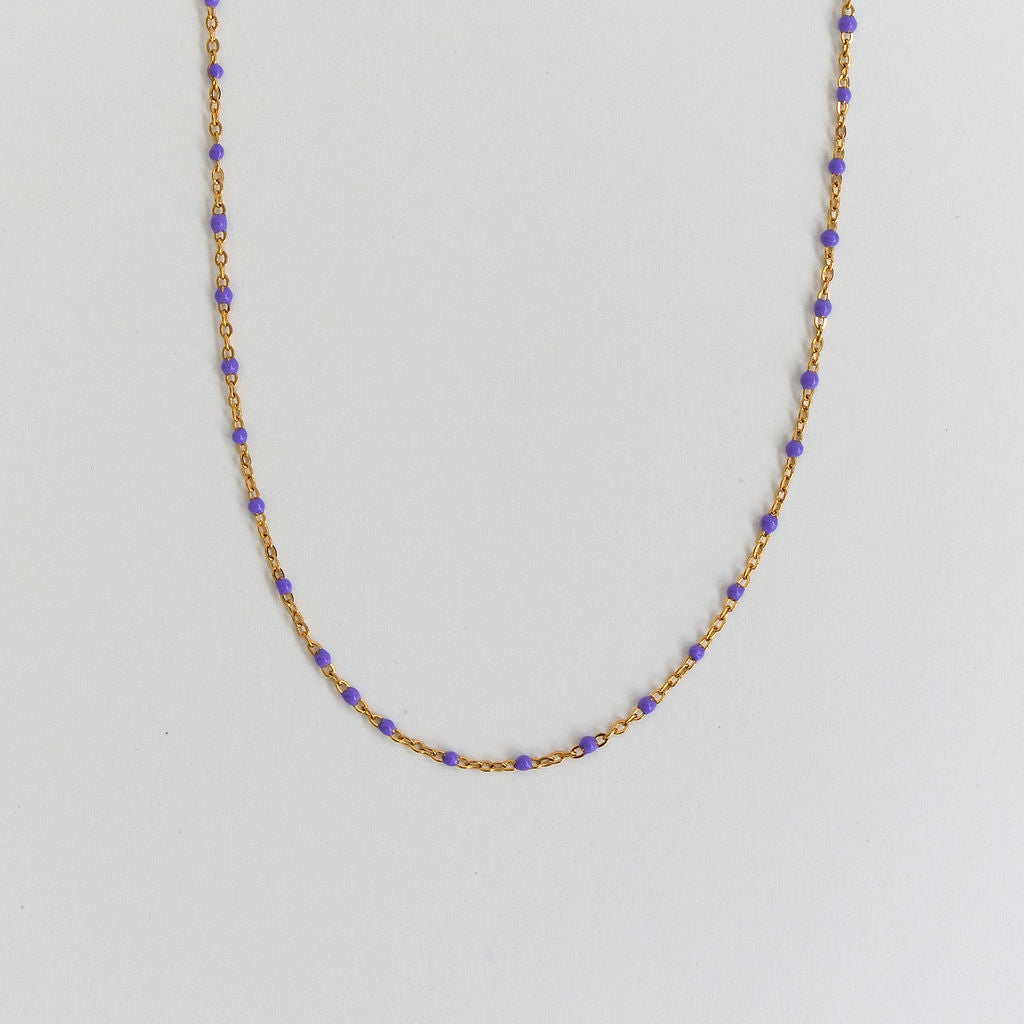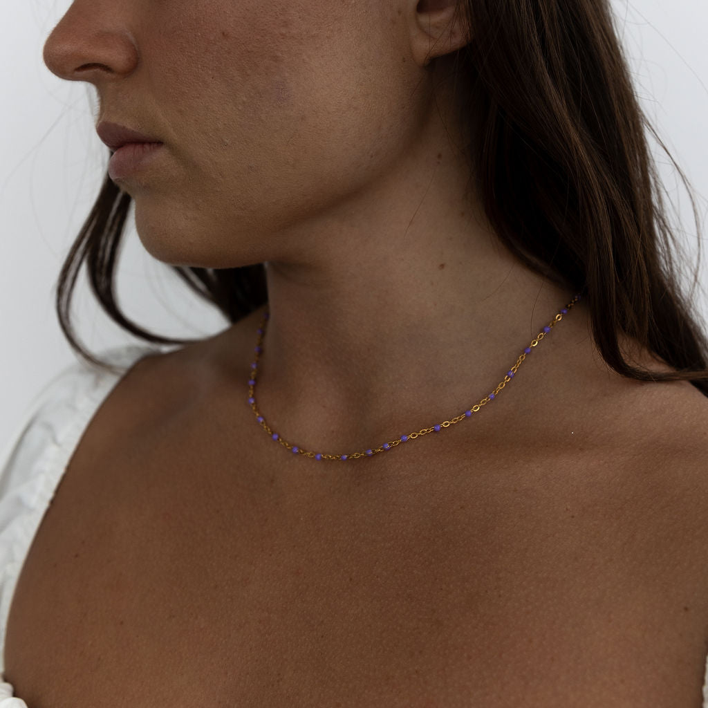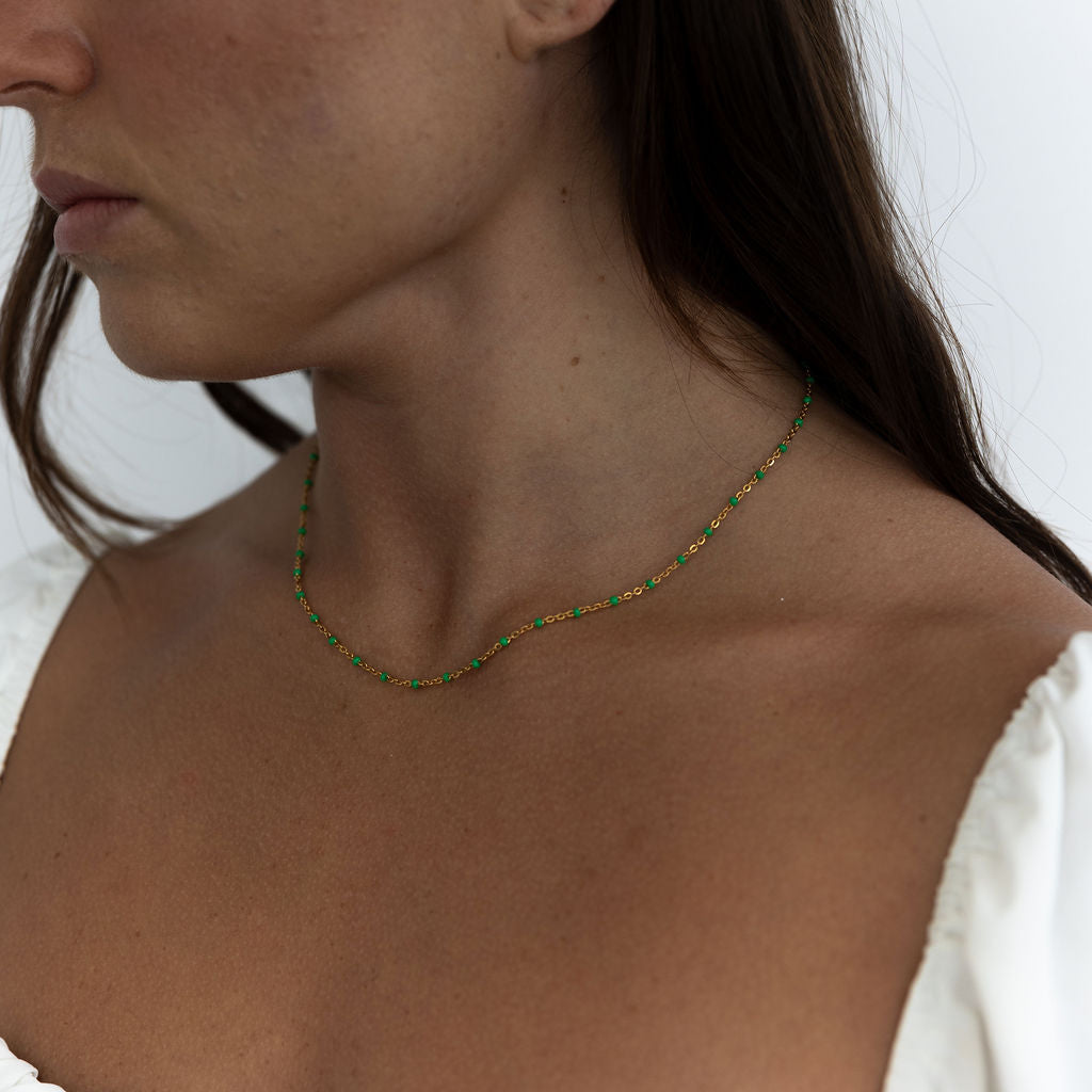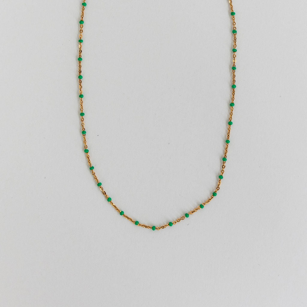 Meet Lily – designed for versatility, this 14k Gold Filled chain effortlessly adapts to your style. Whether worn alone for a fresh and modern look or layered with other necklaces, you have the option to choose from green, white, black, purple or turquoise enamel beads, giving you the flexibility to create the perfect accent for any occasion.