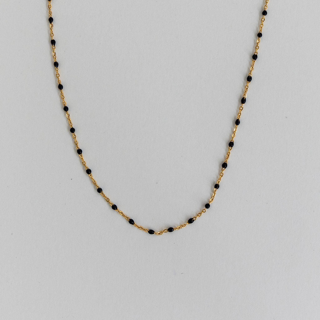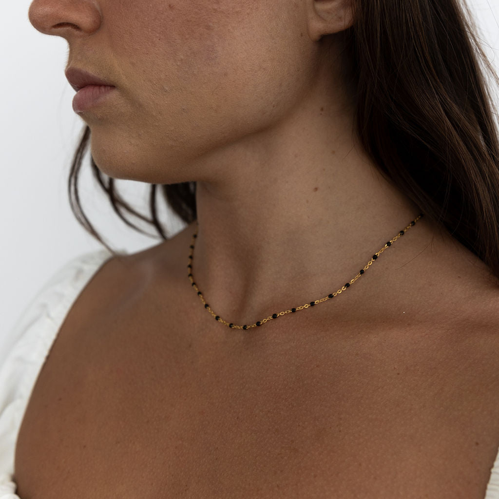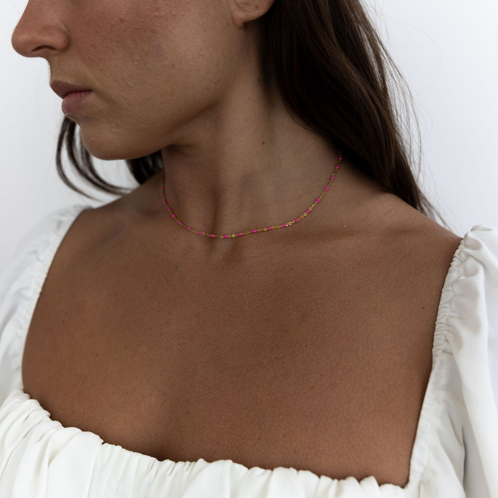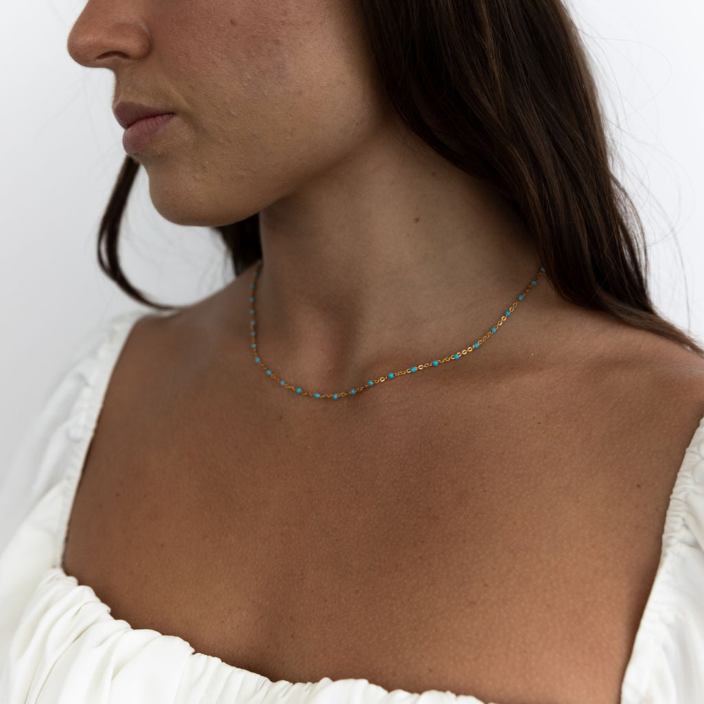 Meet Lily – designed for versatility, this 14k Gold Filled chain effortlessly adapts to your style. Whether worn alone for a fresh and modern look or layered with other necklaces, you have the option to choose from green, white, black, purple or turquoise enamel beads, giving you the flexibility to create the perfect accent for any occasion.