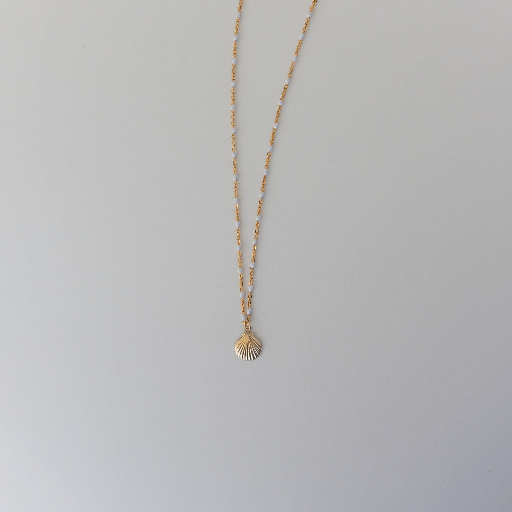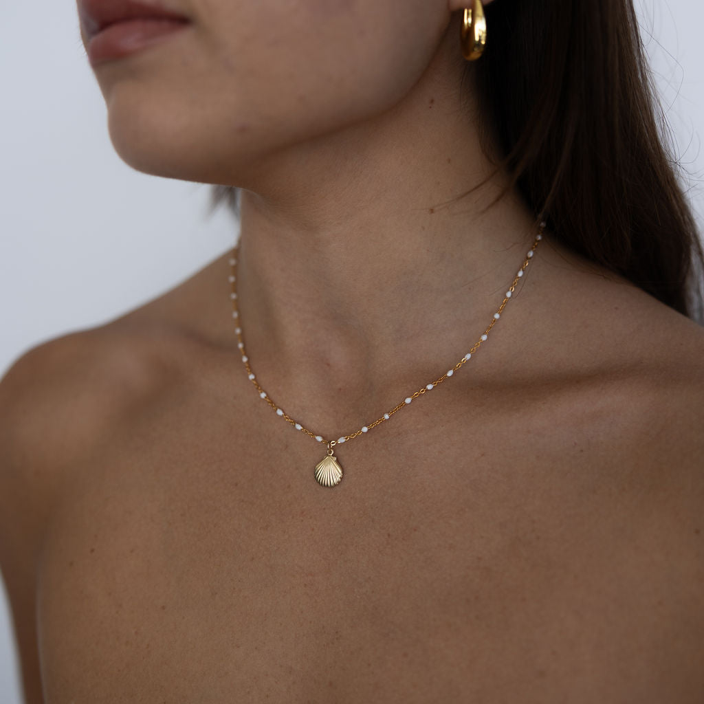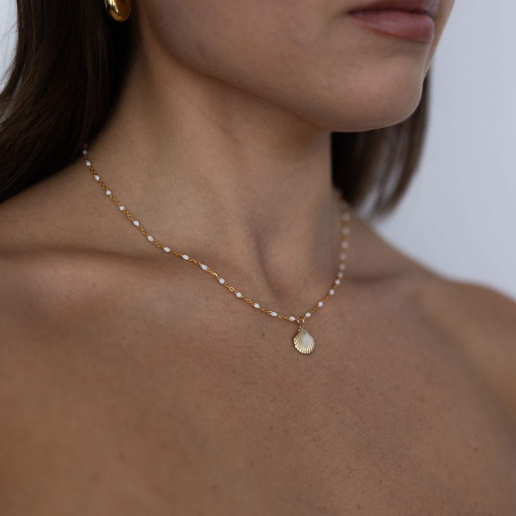 Our Malibu Necklace is a fun and chic way to bring the coastal vibe to your wardrobe. The white enamel beads create a fresh, clean look, while the shell pendant adds a touch of natural beauty and beachy flair.