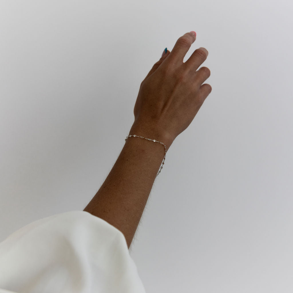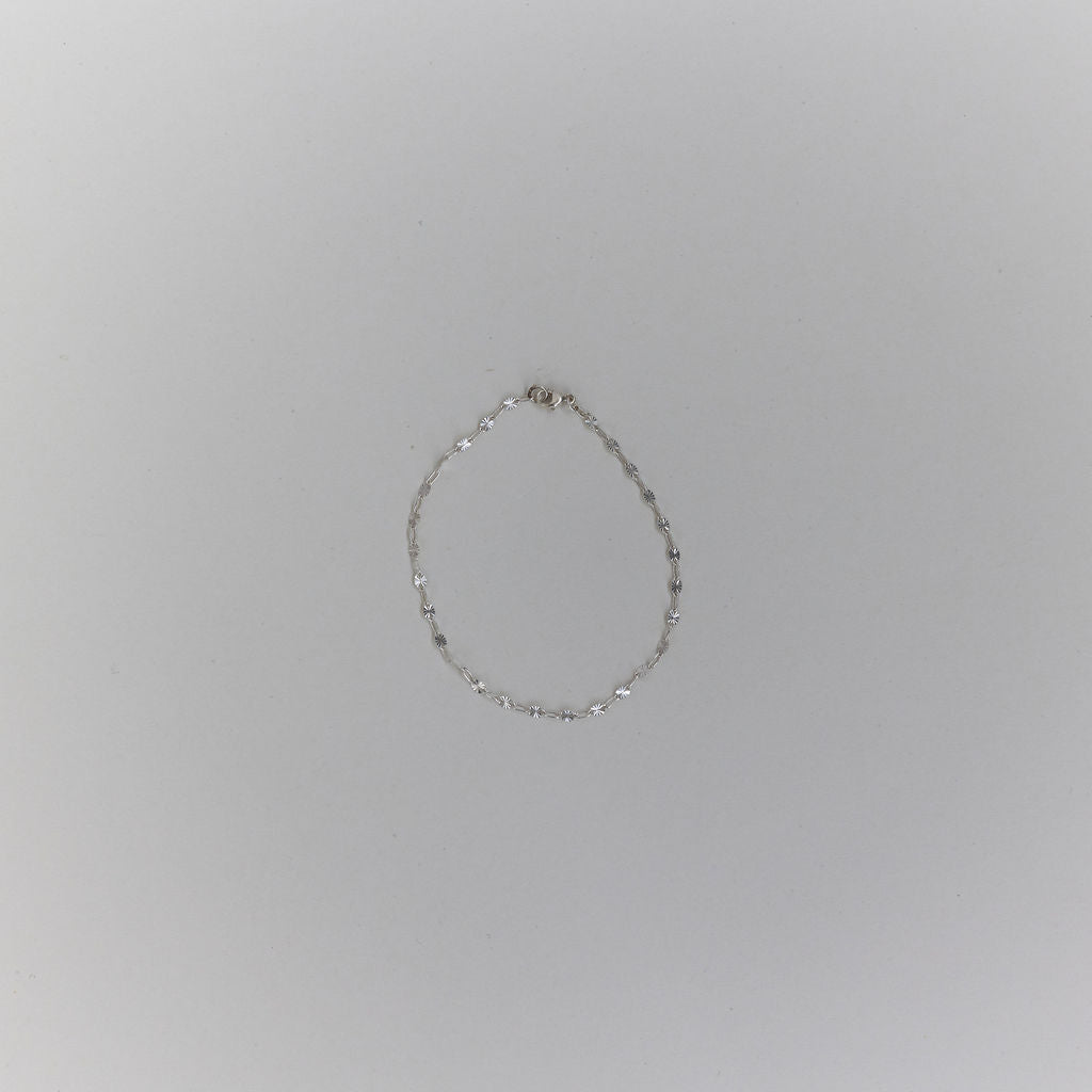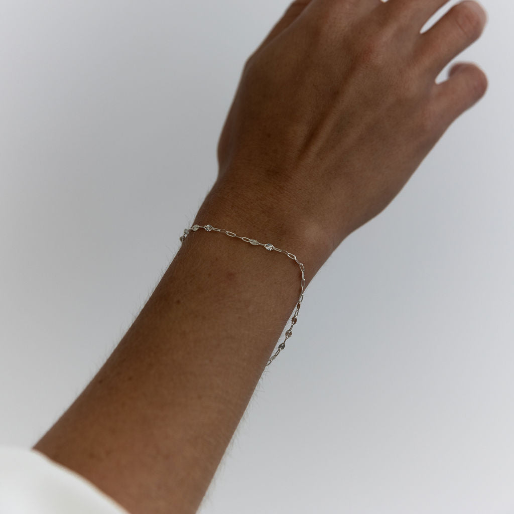 Understated yet full of charm, this dainty bracelet features a twisted chain design with subtle textured links that catch the light just right. Crafted in sterling silver, it adds a hint of elegance and movement to your wrist without overpowering your look. Ideal for layering or wearing on its own for a minimalist statement.