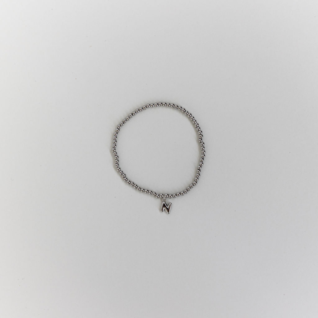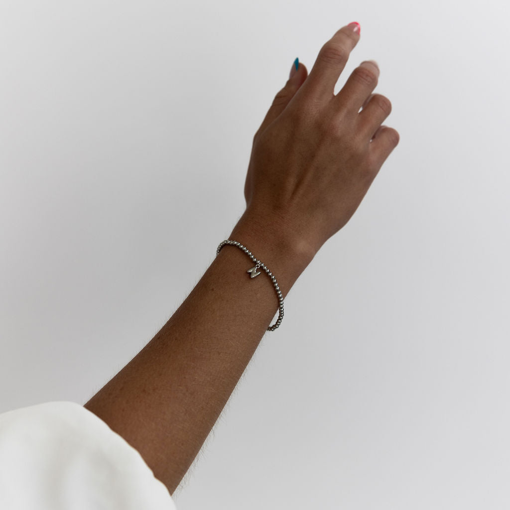 Simple, stretchy, and personal — this silver beaded bracelet features a comfortable elastic band and your choice of an initial charm. Stack it, gift it, or wear it solo for a meaningful everyday piece.