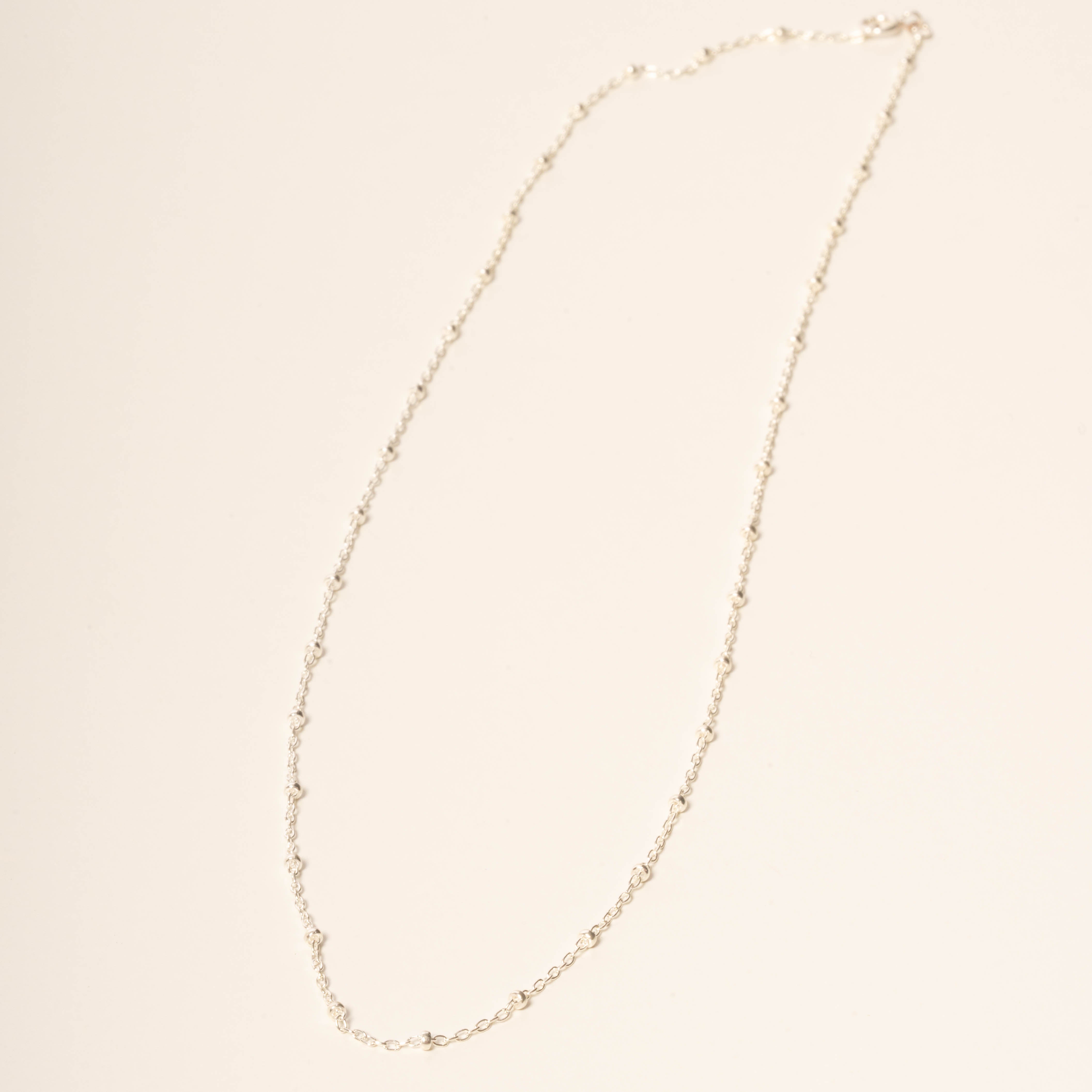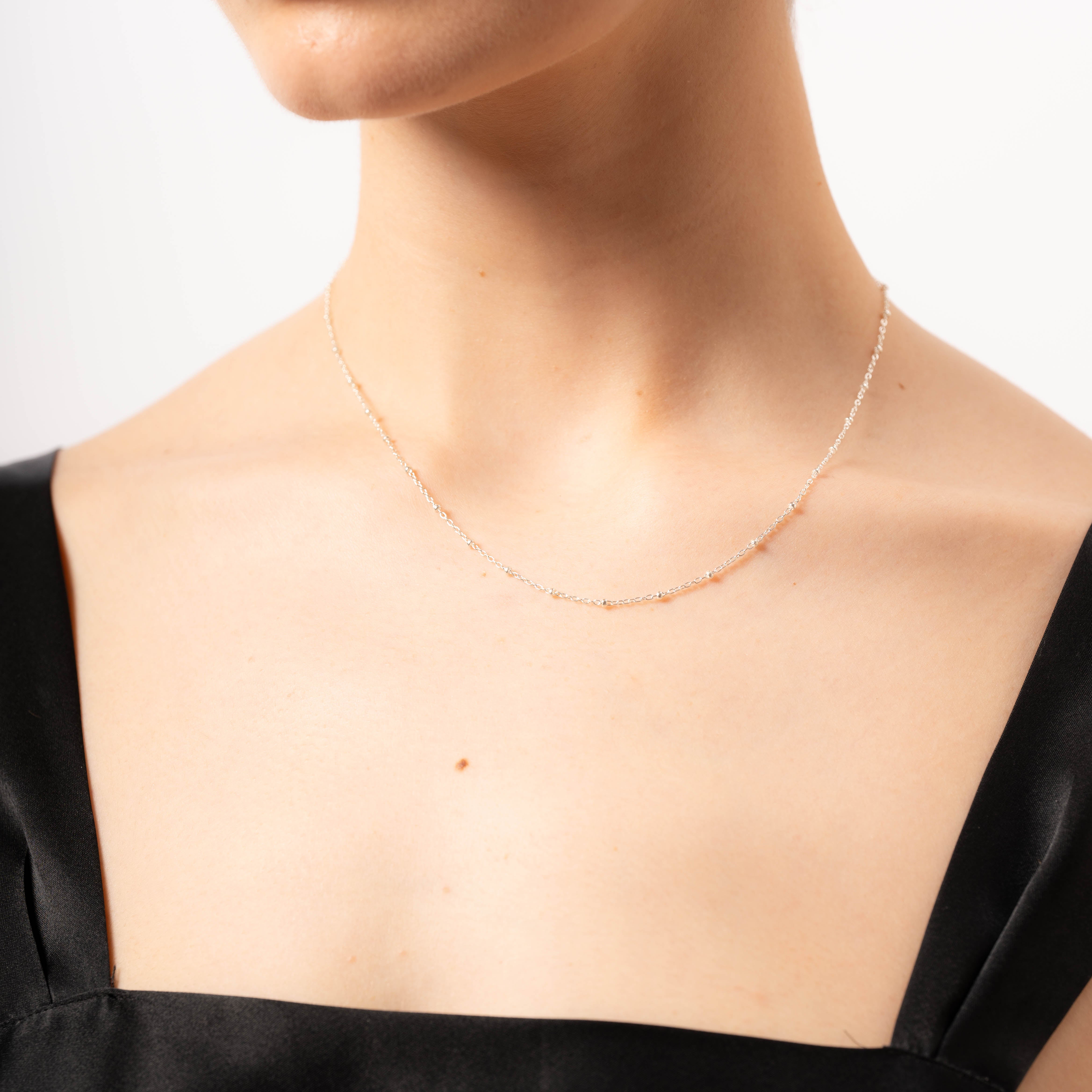 Meet Sara, a Sterling Silver Satellite Beaded Chain – a popular favorite that epitomizes elegance in simplicity. Its enduring popularity is a testament to its delicate charm and versatility, making it an essential addition to any jewelry collection.